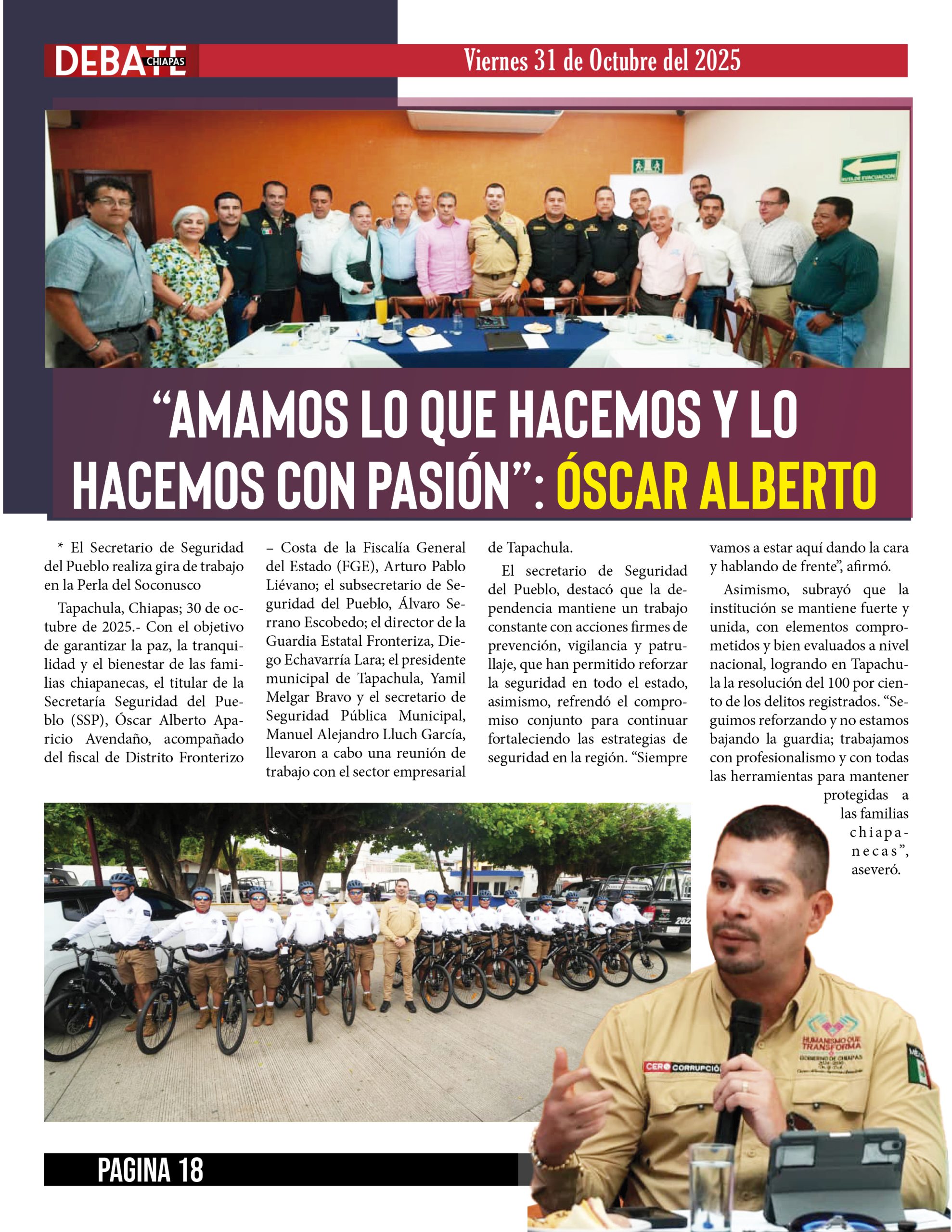 * El Secretario de Seguridad del Pueblo realiza gira de trabajo en la Perla del Soconusco Tapachula, Chiapas; 30 de octubre de 2025.- Con el