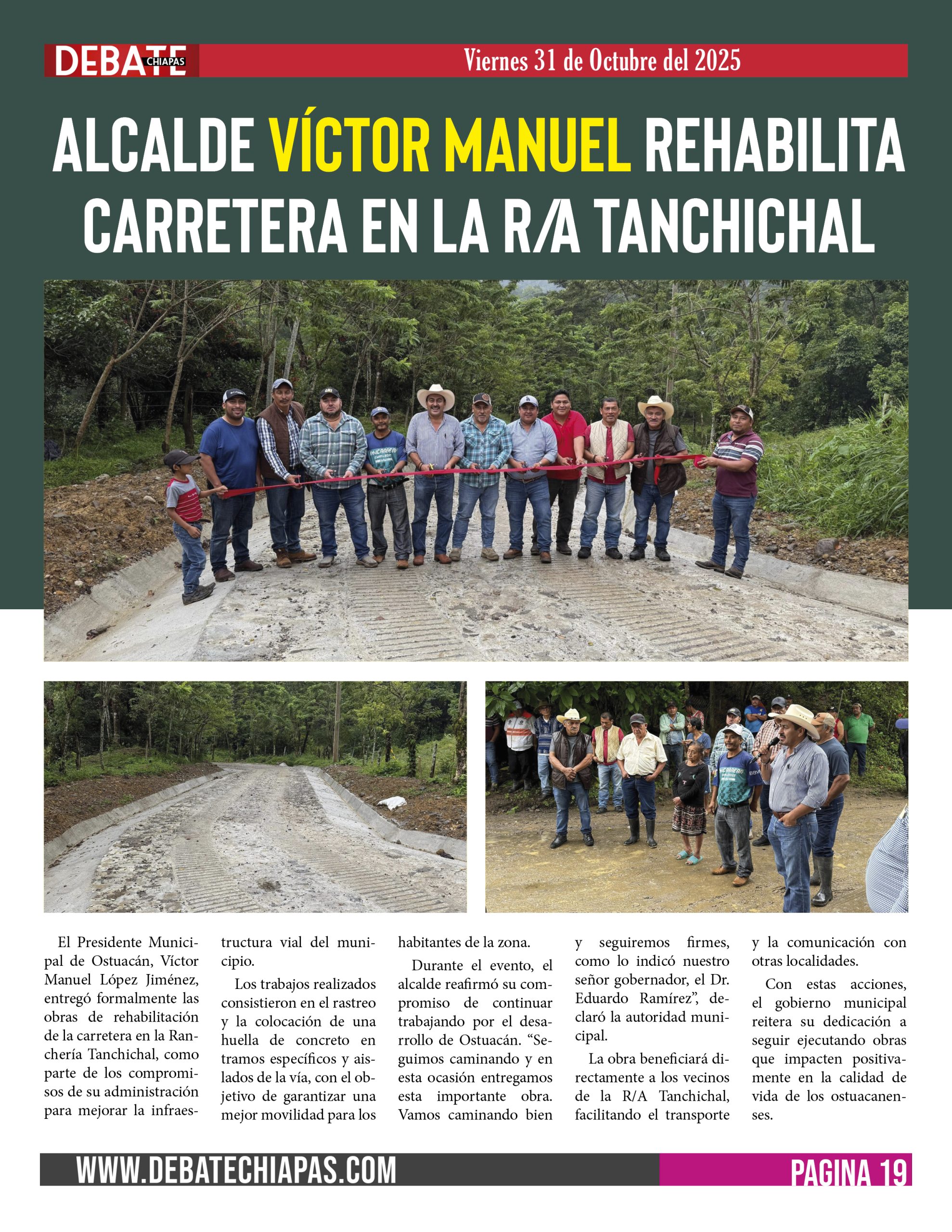 El Presidente Municipal de Ostuacán, Víctor Manuel López Jiménez, entregó formalmente las obras de rehabilitación de la carretera en la Ranchería Tanchichal, como parte de