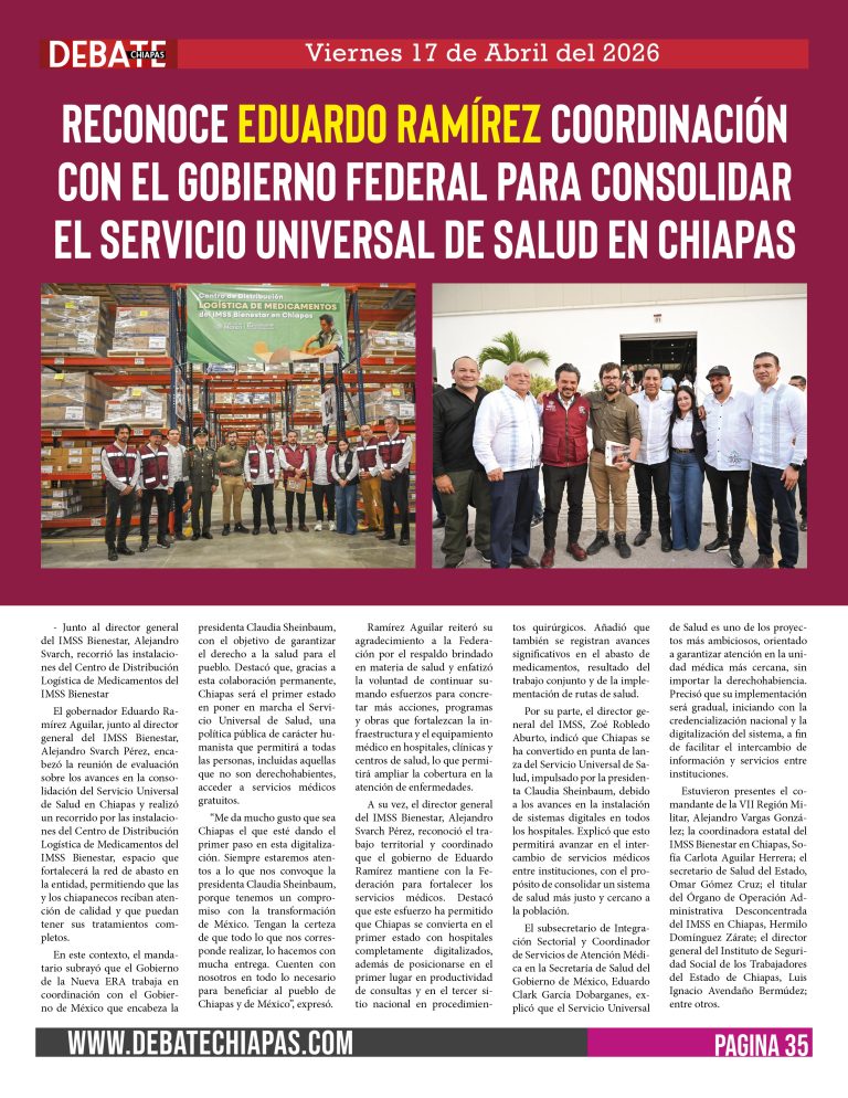 General Reconoce Eduardo Ramírez coordinación con el Gobierno Federal para consolidar el Servicio Universal de Salud en Chiapas Leer más » abril 16, 2026