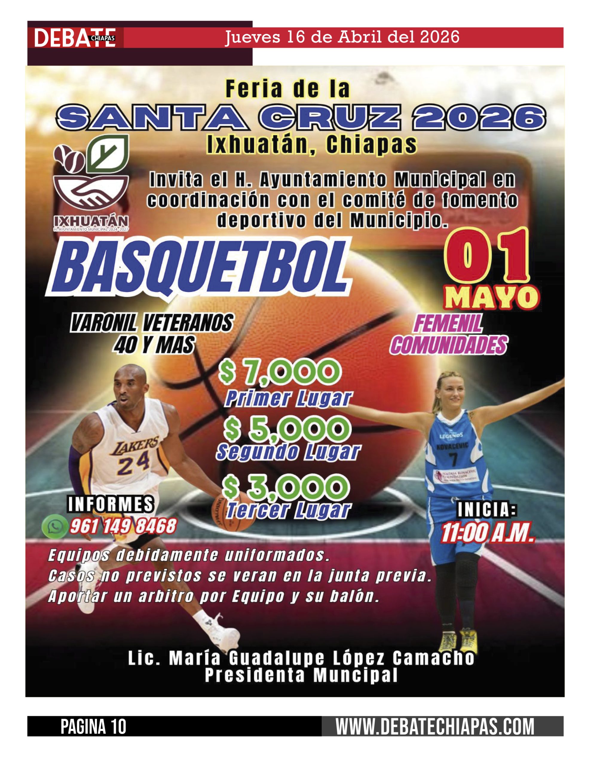 No te pierdas lo eventos de Basquetbol que se estarán realizando del 1 al 3 de mayo en la Unidad Deportiva Santa Cruz de Ixhuatán, no falten, seguimos fomentando el deporte en nuestro Municipio, vamos por mas.