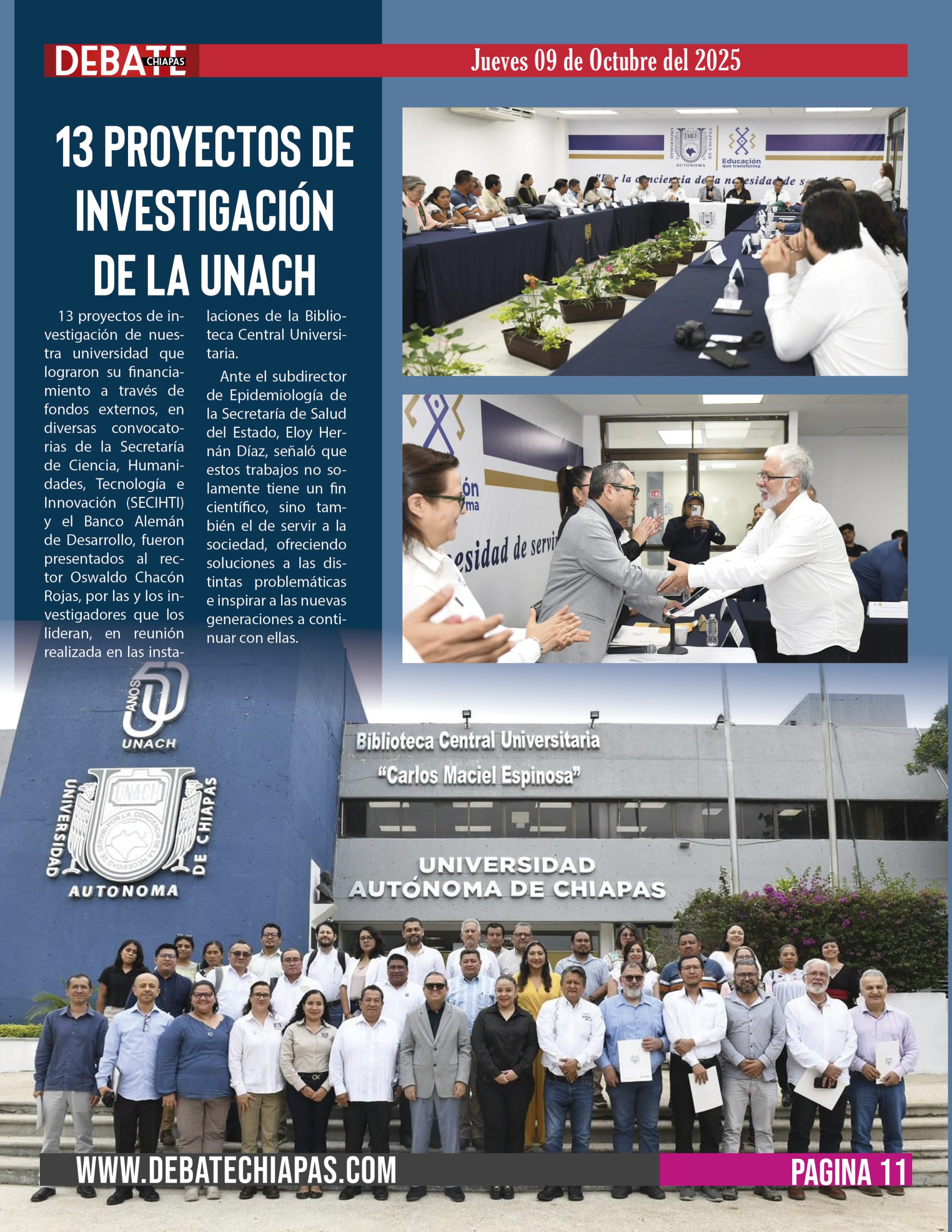 13 proyectos de investigación de nuestra universidad que lograron su financiamiento a través de fondos externos, en diversas convocatorias de la Secretaría de Ciencia, Humanidades, Tecnología e Innovación (SECIHTI) y el Banco Alemán de Desarrollo, fueron presentados al rector Oswaldo Chacón Rojas, por las y los investigadores que los lideran, en reunión realizada en las instalaciones de la Biblioteca Central Universitaria.