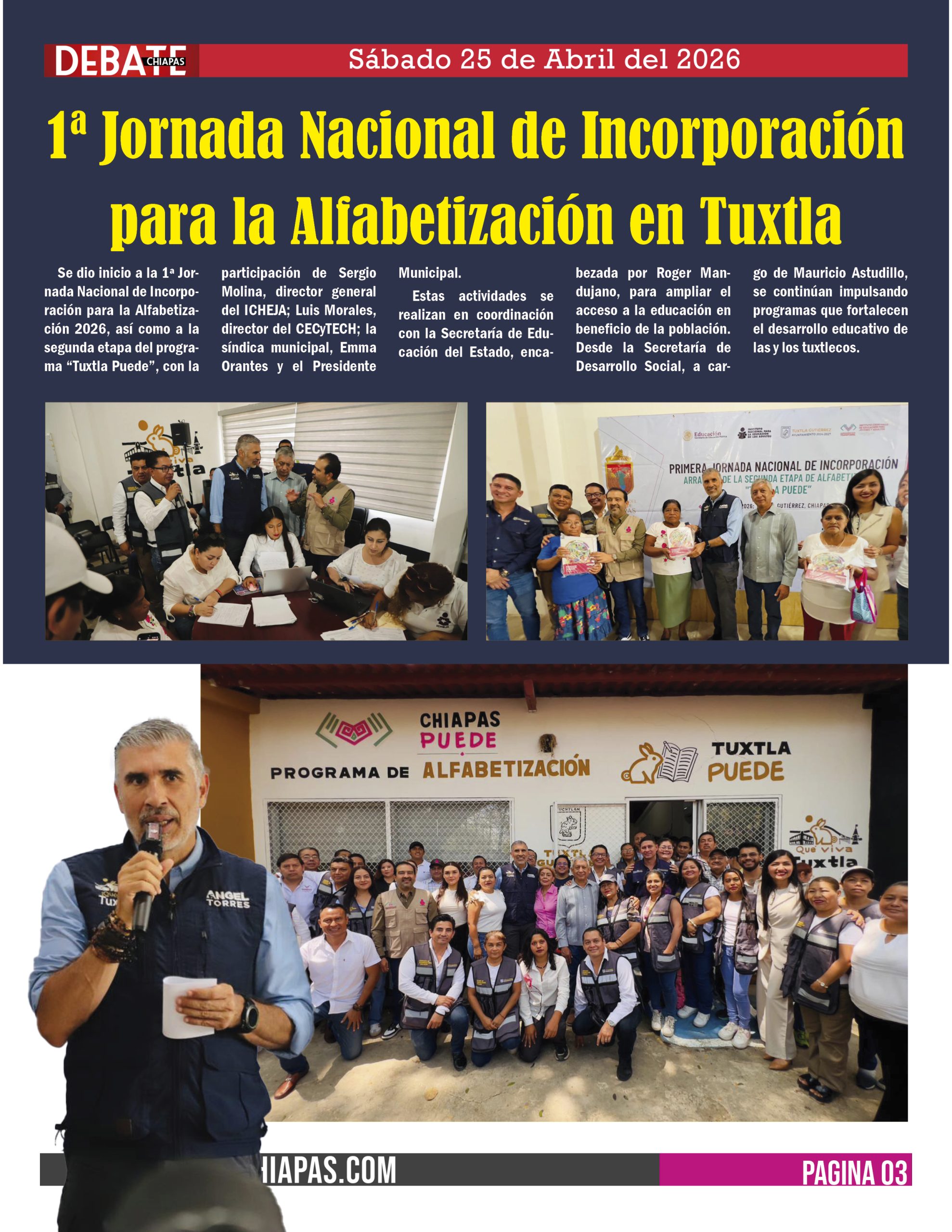 Se dio inicio a la 1ª Jornada Nacional de Incorporación para la Alfabetización 2026, así como a la segunda etapa del programa “Tuxtla Puede”, con la participación de Sergio Molina, director general del ICHEJA; Luis Morales, director del CECyTECH; la síndica municipal, Emma Orantes y el Presidente Municipal.