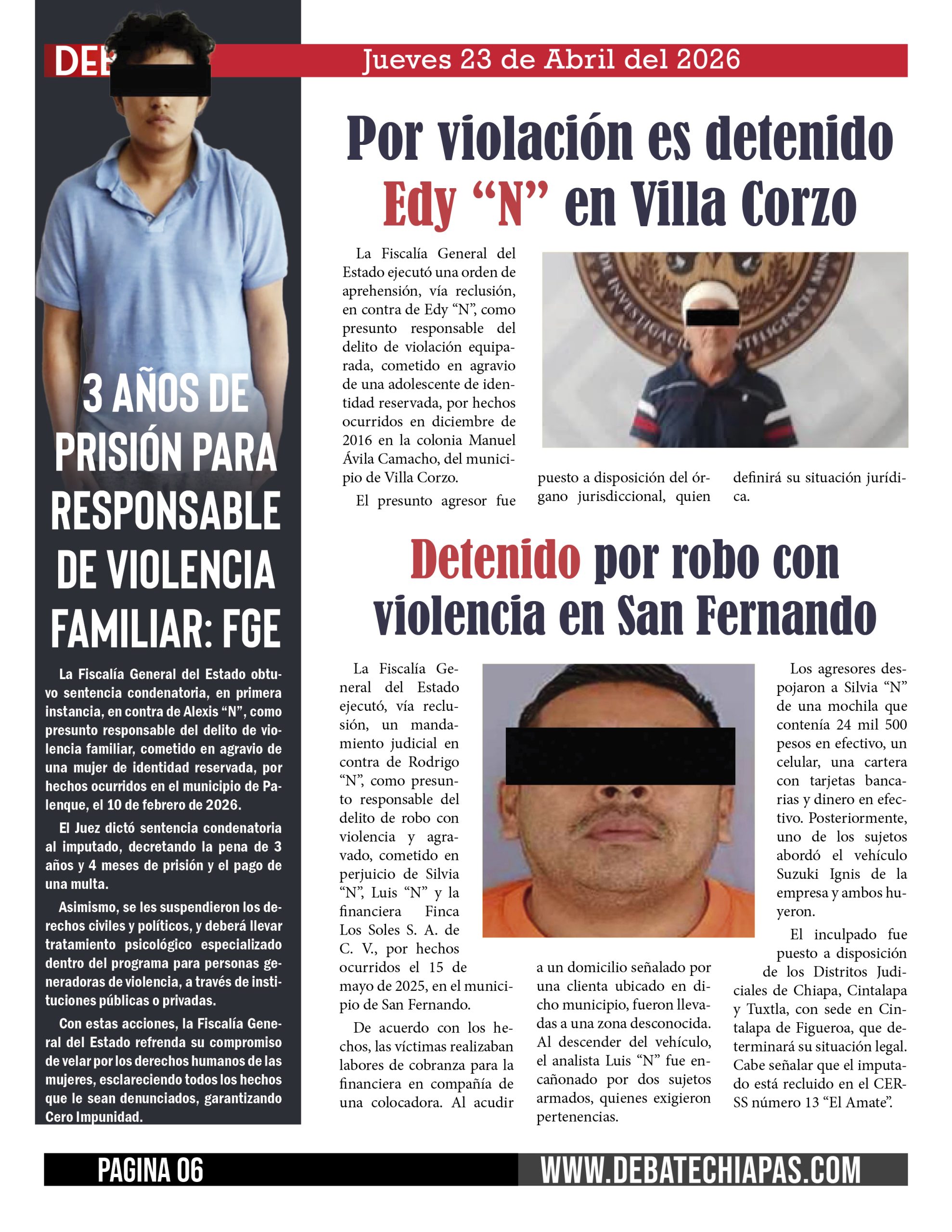 La Fiscalía General del Estado obtuvo sentencia condenatoria, en primera instancia, en contra de Alexis “N”, como presunto responsable del delito de violencia familiar, cometido en agravio de una mujer de identidad reservada, por hechos ocurridos en el municipio de Palenque, el 10 de febrero de 2026.