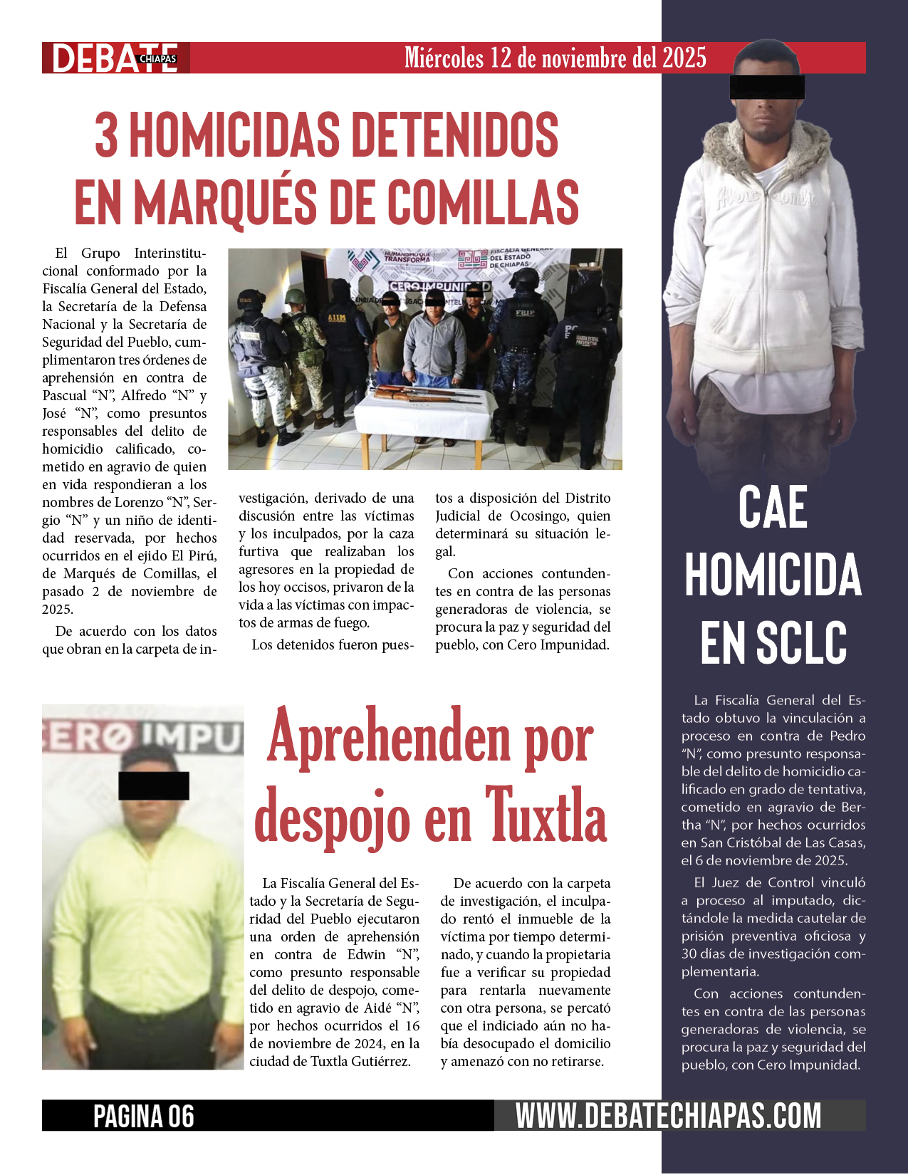 El Grupo Interinstitucional conformado por la Fiscalía General del Estado, la Secretaría de la Defensa Nacional y la Secretaría de Seguridad del Pueblo, cumplimentaron tres órdenes de aprehensión en contra de Pascual “N”, Alfredo “N” y José “N”, como presuntos responsables del delito de homicidio calificado, cometido en agravio de quien en vida respondieran a los nombres de Lorenzo “N”, Sergio “N” y un niño de identidad reservada, por hechos ocurridos en el ejido El Pirú, de Marqués de Comillas, el pasado 2 de noviembre de 2025.