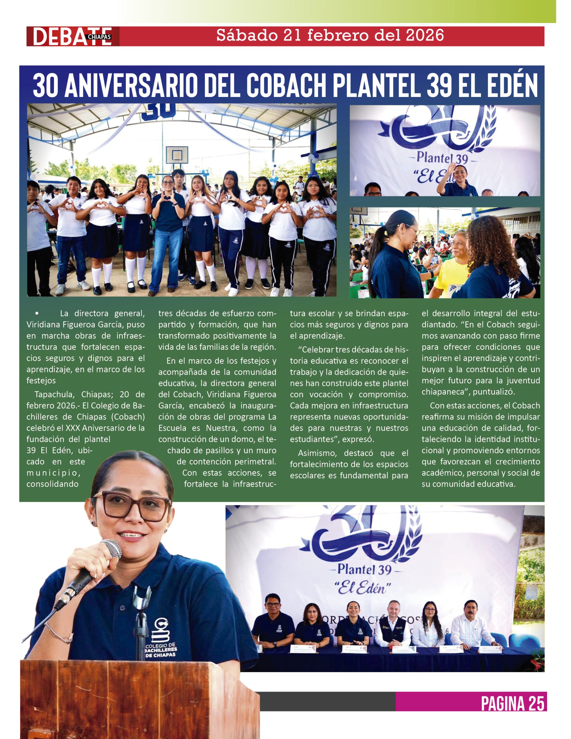 Tapachula, Chiapas; 20 de febrero 2026.- El Colegio de Bachilleres de Chiapas (Cobach) celebró el XXX Aniversario de la fundación del plantel 39 El Edén, ubicado en este municipio, consolidando tres décadas de esfuerzo compartido y formación, que han transformado positivamente la vida de las familias de la región.