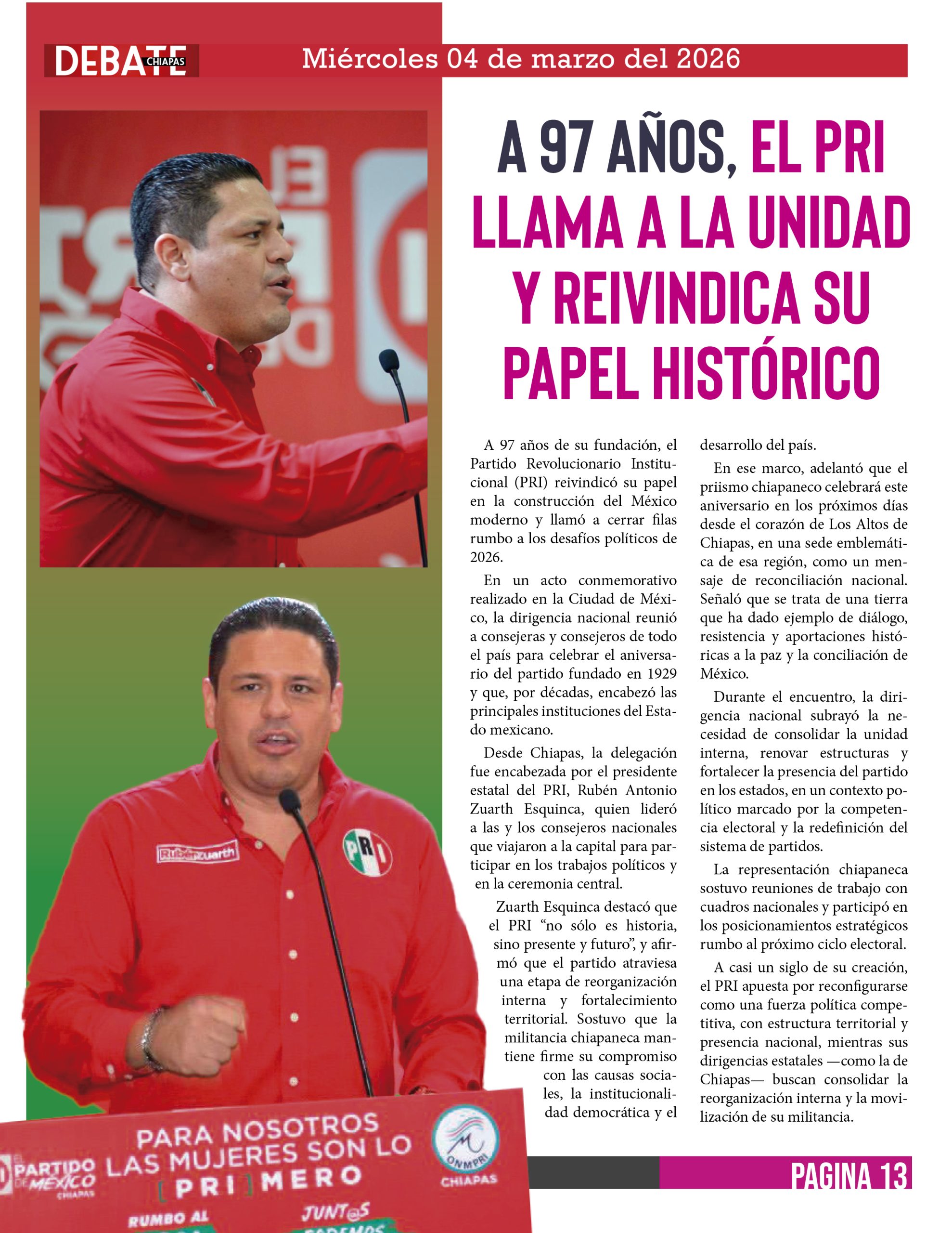 A casi un siglo de su creación, el PRI apuesta por reconfigurarse como una fuerza política competitiva, con estructura territorial y presencia nacional, mientras sus dirigencias estatales —como la de Chiapas— buscan consolidar la reorganización interna y la movilización de su militancia.