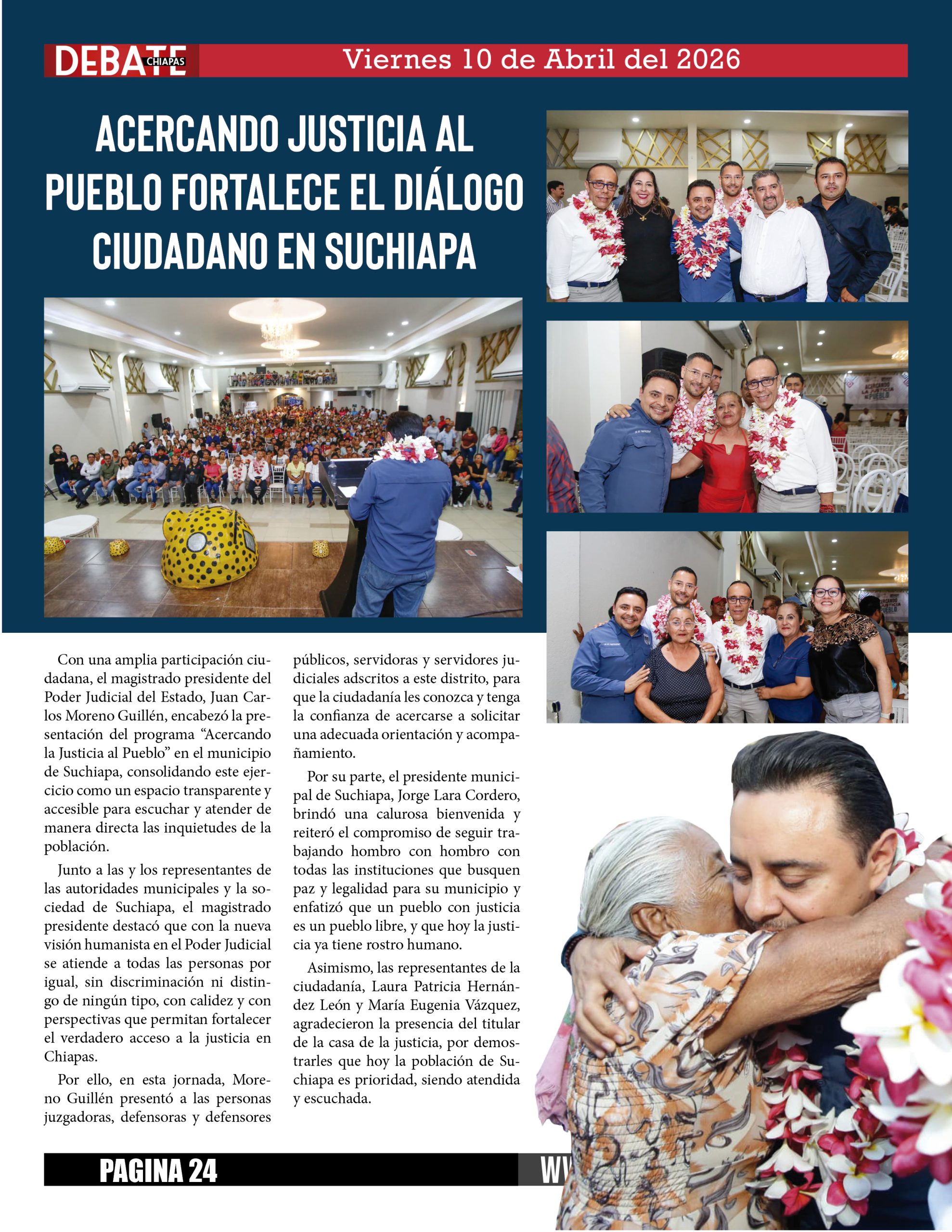 Con una amplia participación ciudadana, el magistrado presidente del Poder Judicial del Estado, Juan Carlos Moreno Guillén, encabezó la presentación del programa “Acercando la Justicia al Pueblo” en el municipio de Suchiapa, consolidando este ejercicio como un espacio transparente y accesible para escuchar y atender de manera directa las inquietudes de la población.