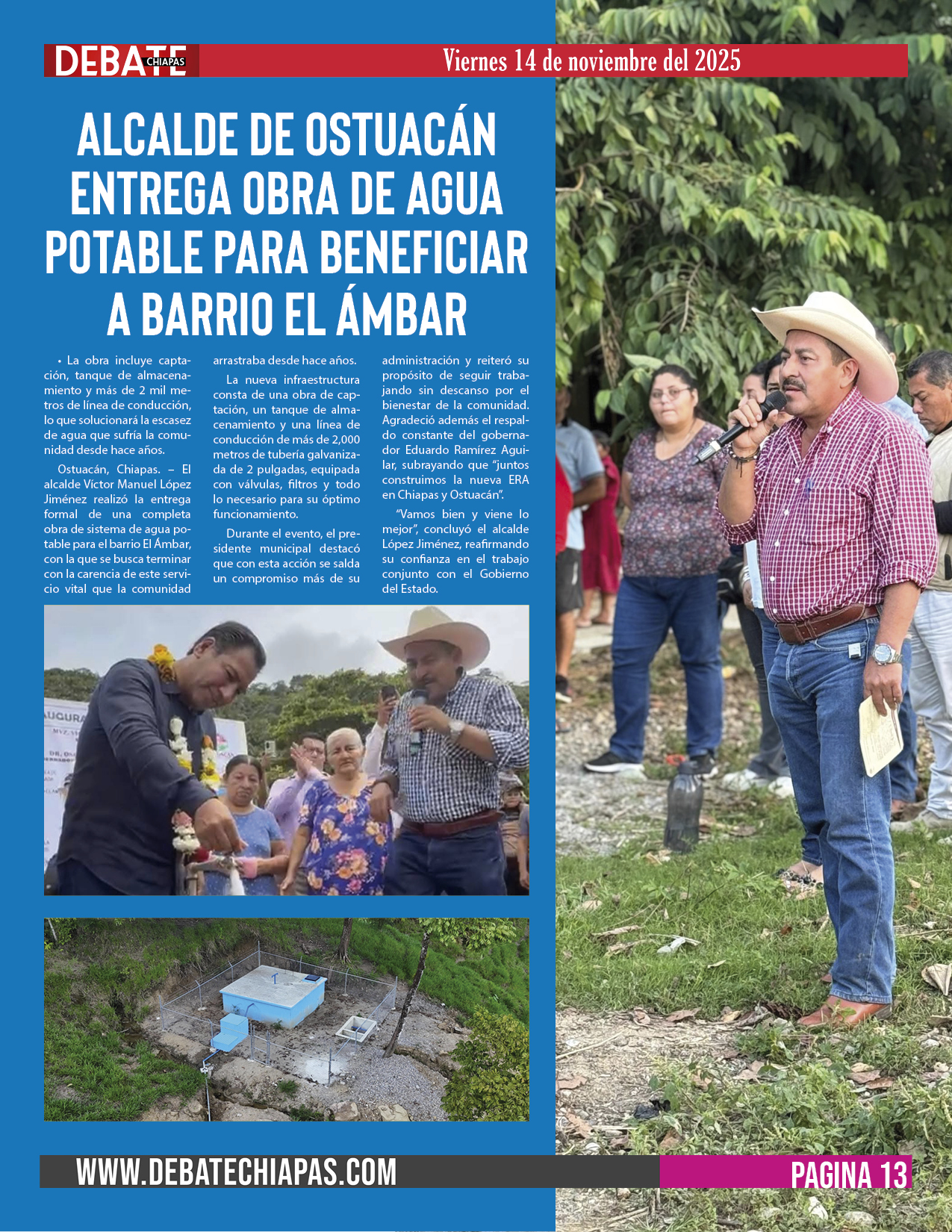Ostuacán, Chiapas. – El alcalde Víctor Manuel López Jiménez realizó la entrega formal de una completa obra de sistema de agua potable para el barrio El Ámbar, con la que se busca terminar con la carencia de este servicio vital que la comunidad arrastraba desde hace años.
