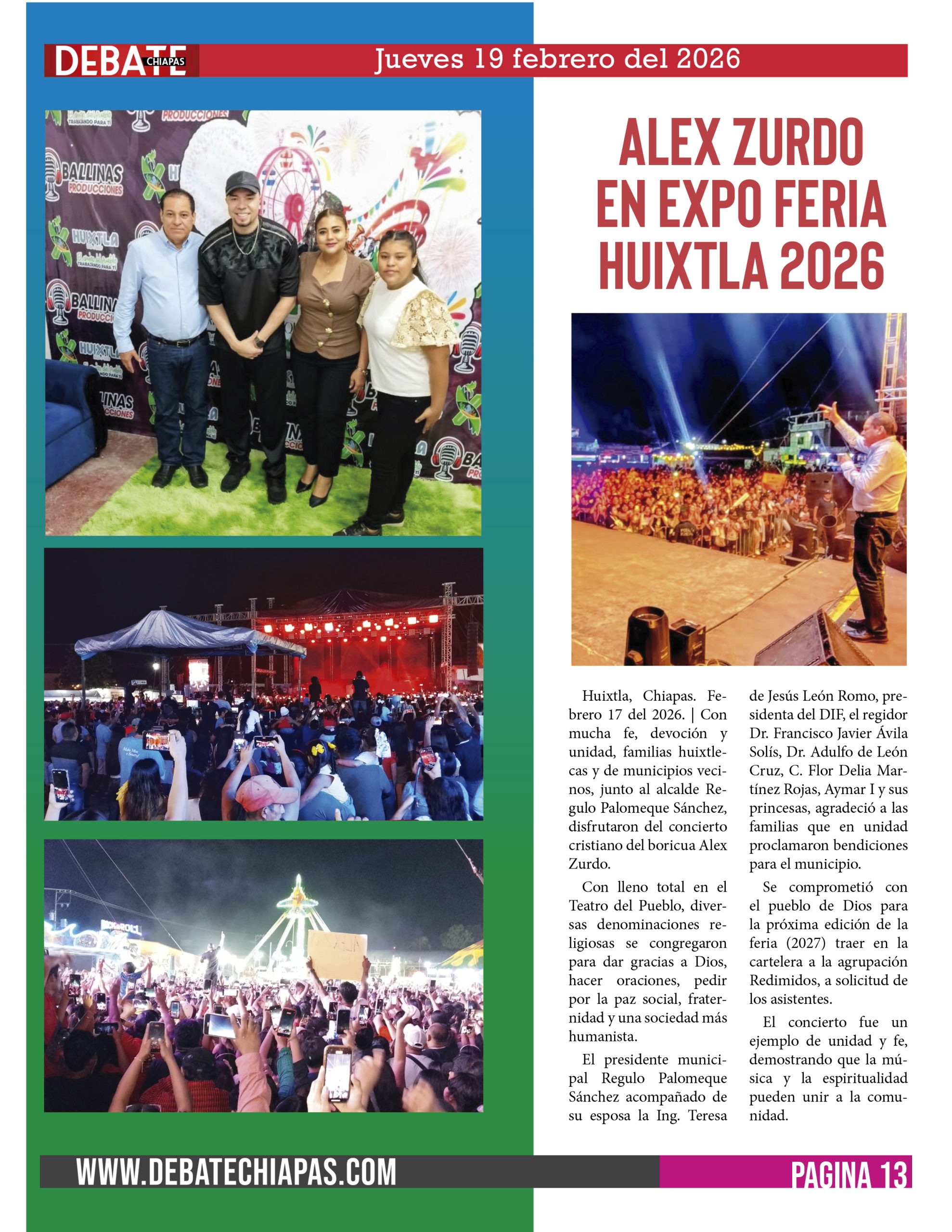 Huixtla, Chiapas. Febrero 17 del 2026. | Con mucha fe, devoción y unidad, familias huixtlecas y de municipios vecinos, junto al alcalde Regulo Palomeque Sánchez, disfrutaron del concierto cristiano del boricua Alex Zurdo.