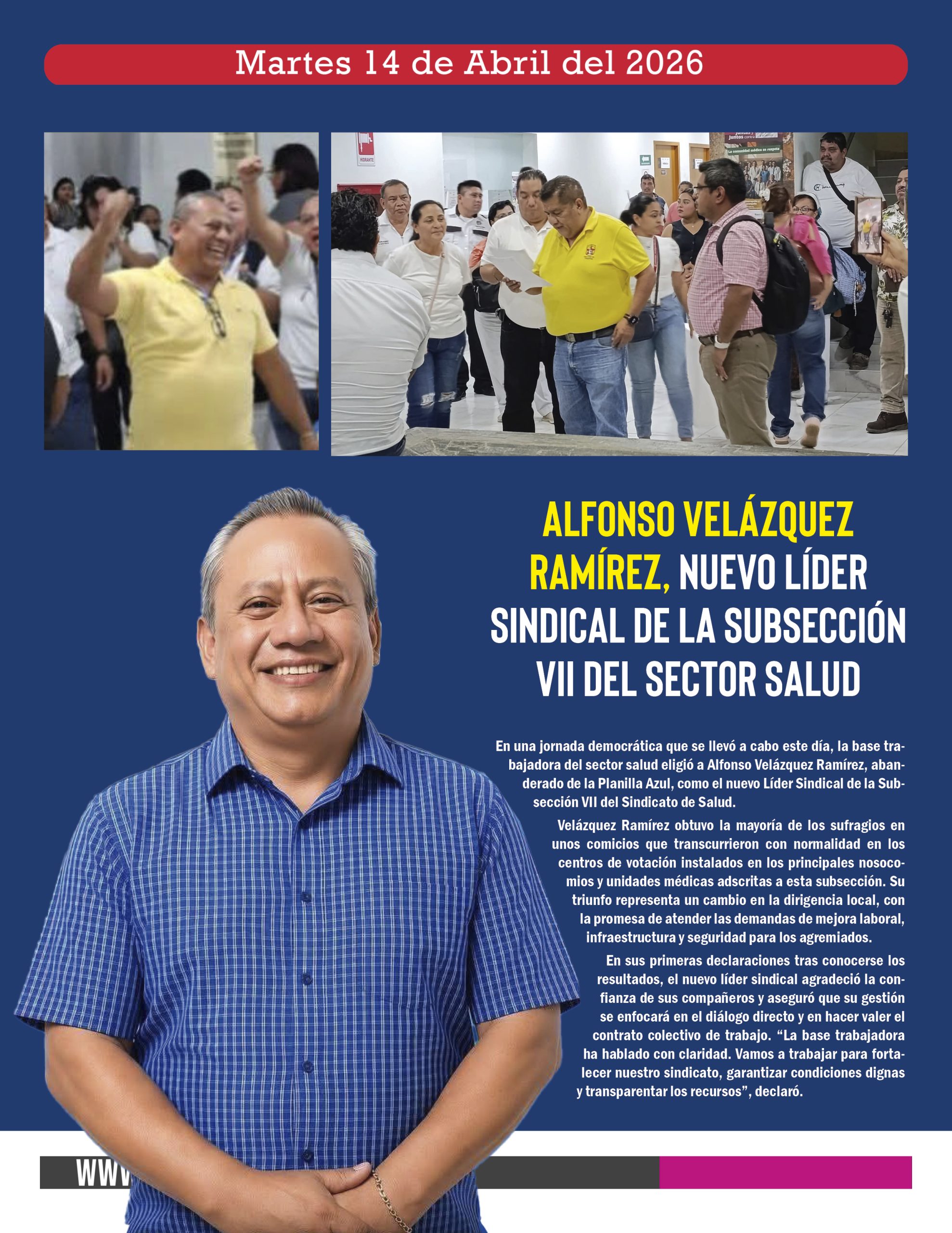 En una jornada democrática que se llevó a cabo este día, la base trabajadora del sector salud eligió a Alfonso Velázquez Ramírez, abanderado de la Planilla Azul, como el nuevo Líder Sindical de la Subsección VII del Sindicato de Salud.