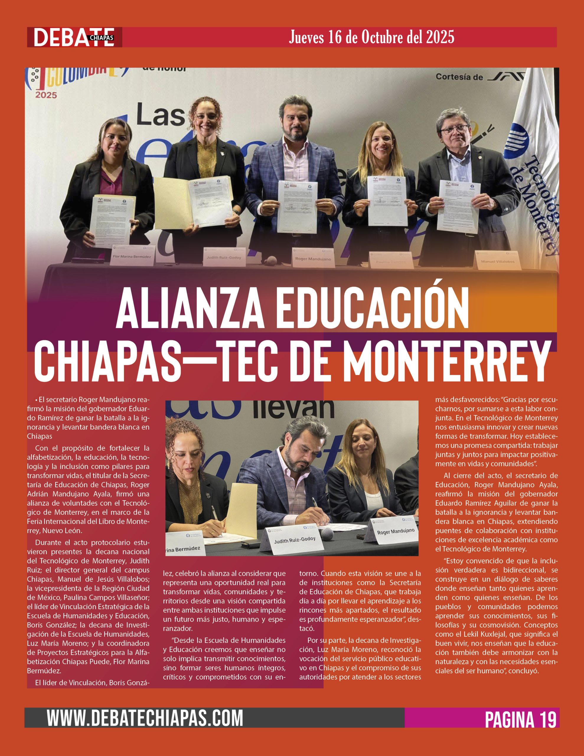 Con el propósito de fortalecer la alfabetización, la educación, la tecnología y la inclusión como pilares para transformar vidas, el titular de la Secretaría de Educación de Chiapas, Roger Adrián Mandujano Ayala, firmó una alianza de voluntades con el Tecnológico de Monterrey, en el marco de la Feria Internacional del Libro de Monterrey, Nuevo León.