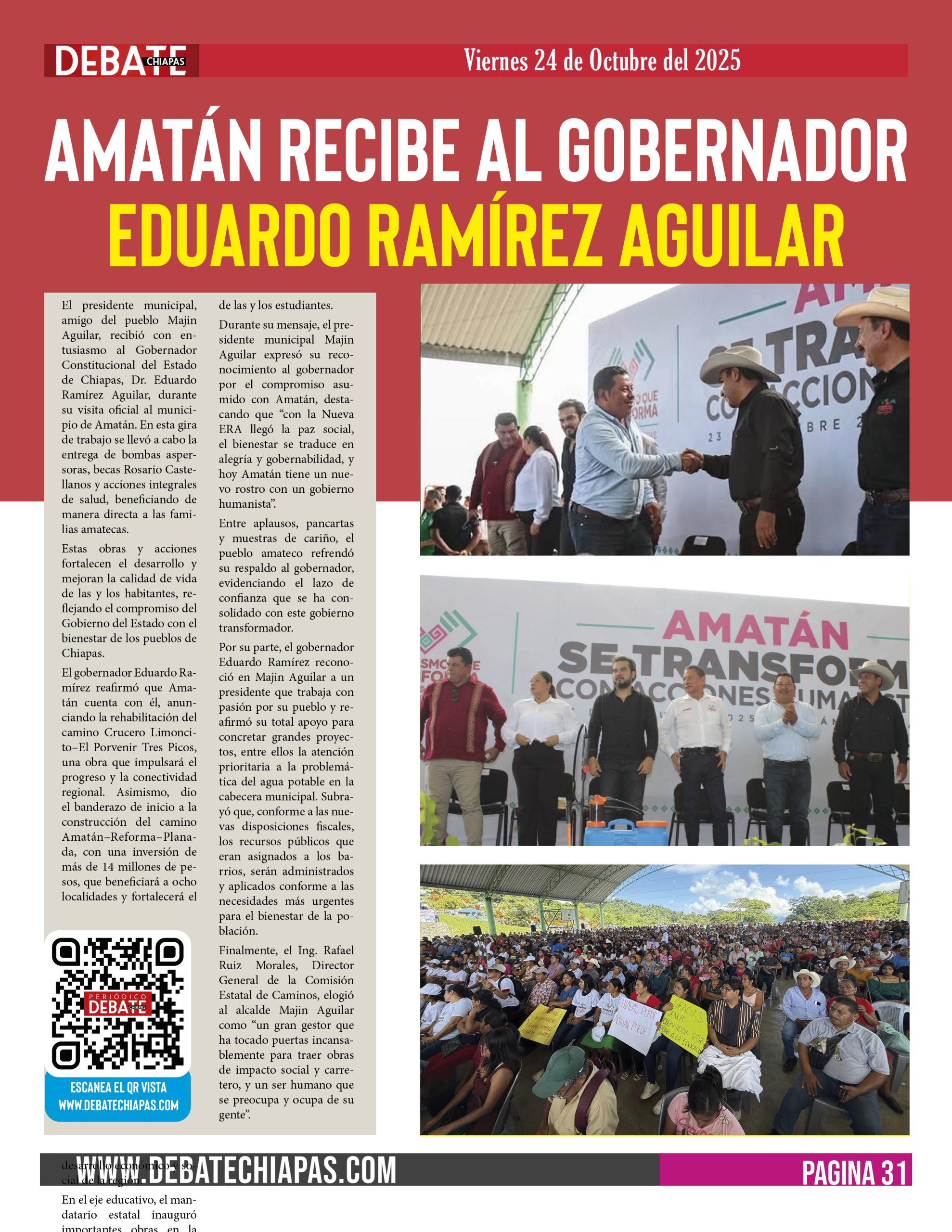 El presidente municipal, amigo del pueblo Majin Aguilar, recibió con entusiasmo al Gobernador Constitucional del Estado de Chiapas, Dr. Eduardo Ramírez Aguilar, durante su visita oficial al municipio de Amatán. En esta gira de trabajo se llevó a cabo la entrega de bombas aspersoras, becas Rosario Castellanos y acciones integrales de salud, beneficiando de manera directa a las familias amatecas.