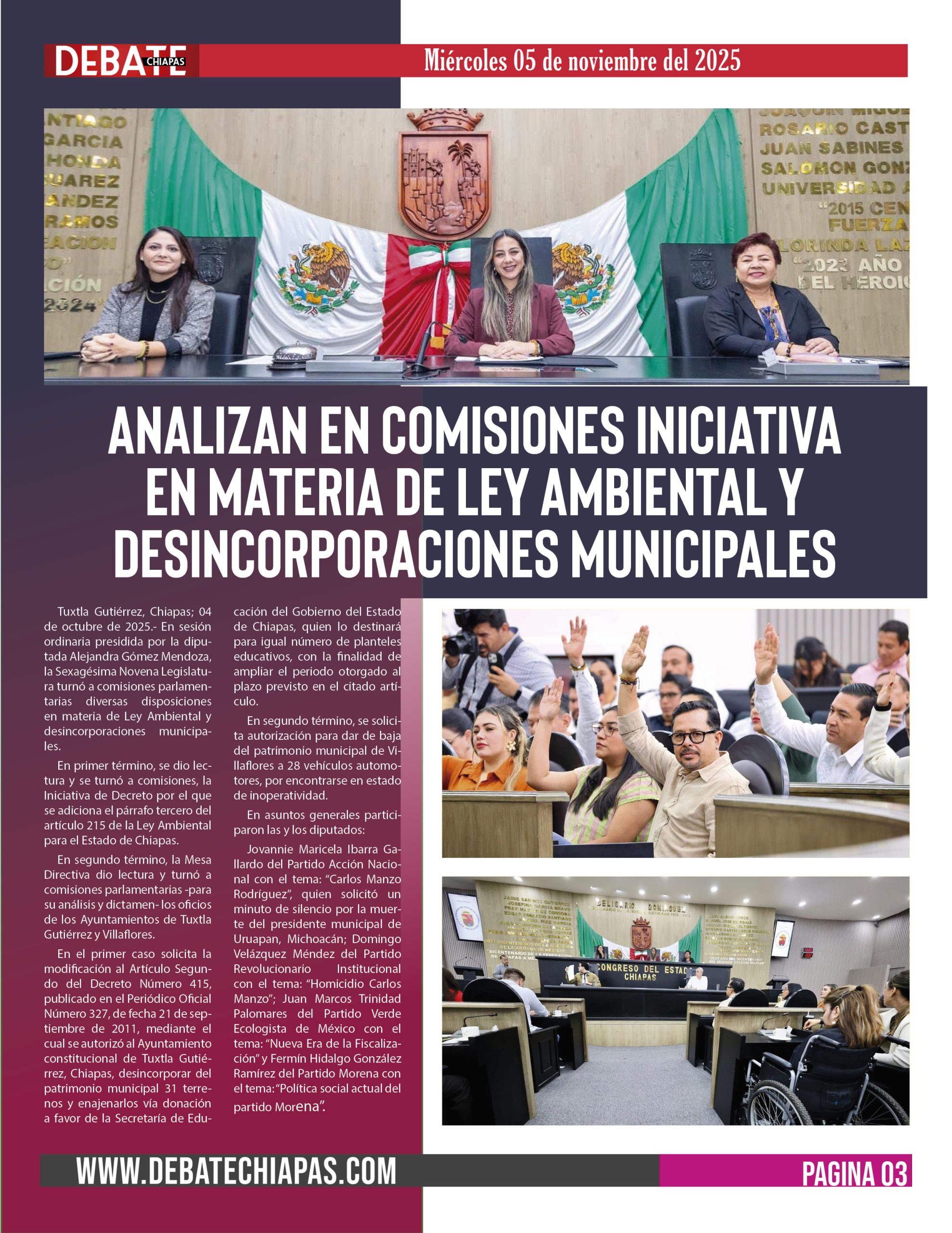 Tuxtla Gutiérrez, Chiapas; 04 de octubre de 2025.- En sesión ordinaria presidida por la diputada Alejandra Gómez Mendoza, la Sexagésima Novena Legislatura turnó a comisiones parlamentarias diversas disposiciones en materia de Ley Ambiental y desincorporaciones municipales.