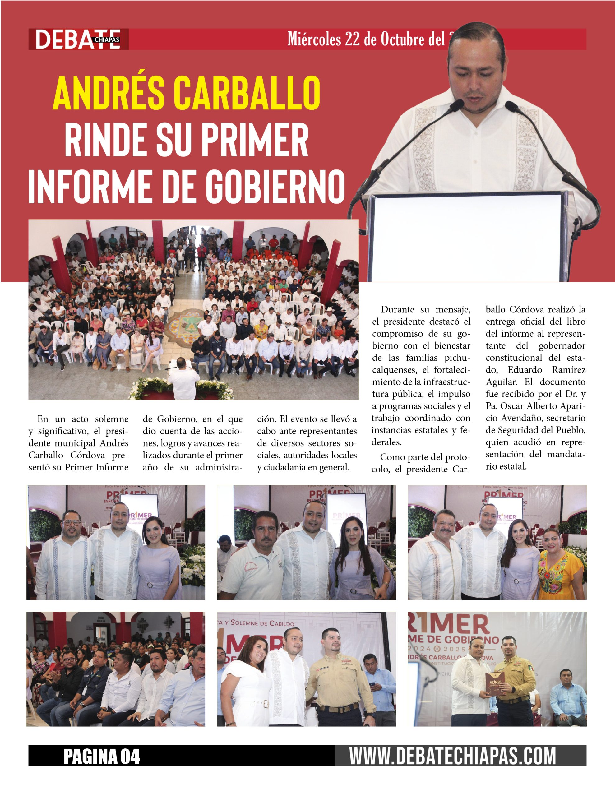En un acto solemne y significativo, el presidente municipal Andrés Carballo Córdova presentó su Primer Informe de Gobierno, en el que dio cuenta de las acciones, logros y avances realizados durante el primer año de su administración. El evento se llevó a cabo ante representantes de diversos sectores sociales, autoridades locales y ciudadanía en general.