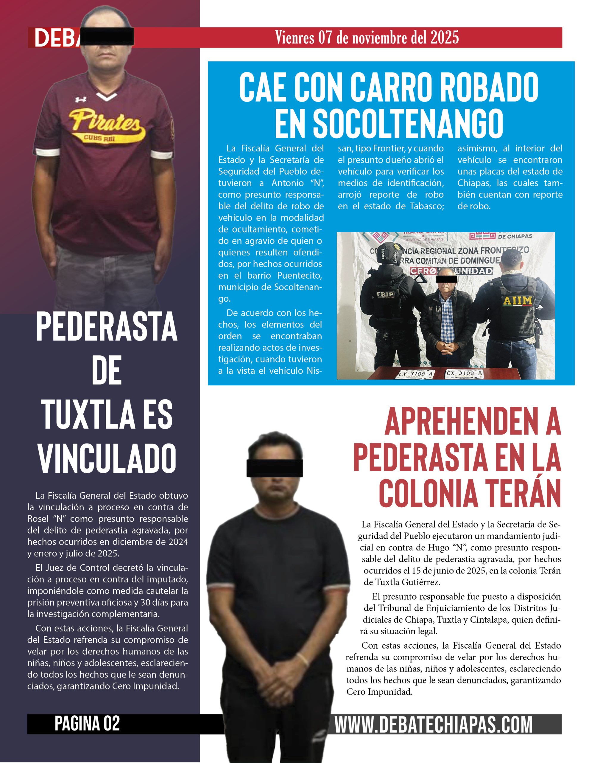 La Fiscalía General del Estado y la Secretaría de Seguridad del Pueblo ejecutaron un mandamiento judicial en contra de Hugo “N”, como presunto responsable del delito de pederastia agravada, por hechos ocurridos el 15 de junio de 2025, en la colonia Terán de Tuxtla Gutiérrez.