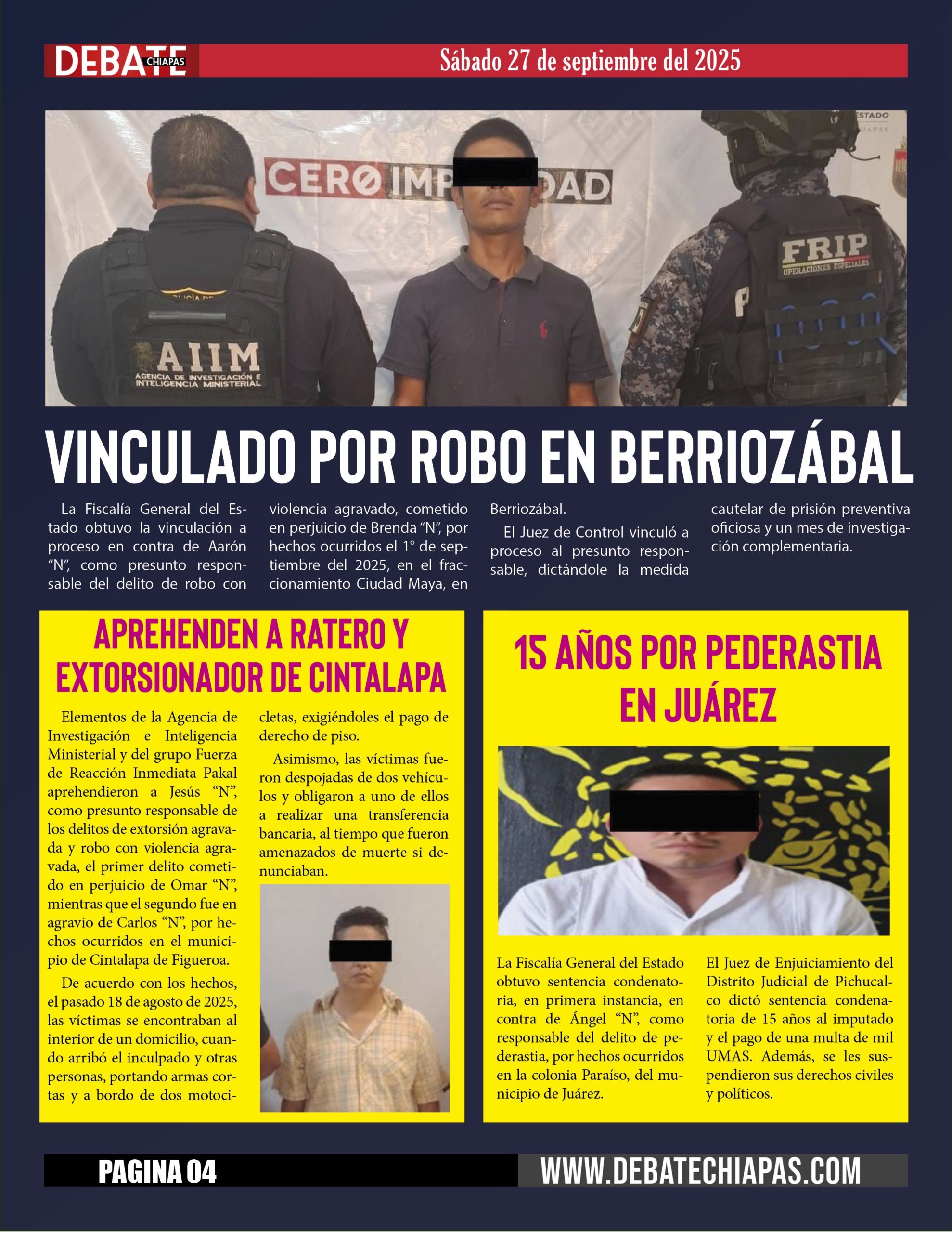 Elementos de la Agencia de Investigación e Inteligencia Ministerial y del grupo Fuerza de Reacción Inmediata Pakal aprehendieron a Jesús “N”, como presunto responsable de los delitos de extorsión agravada y robo con violencia agravada, el primer delito cometido en perjuicio de Omar “N”, mientras que el segundo fue en agravio de Carlos “N”, por hechos ocurridos en el municipio de Cintalapa de Figueroa.