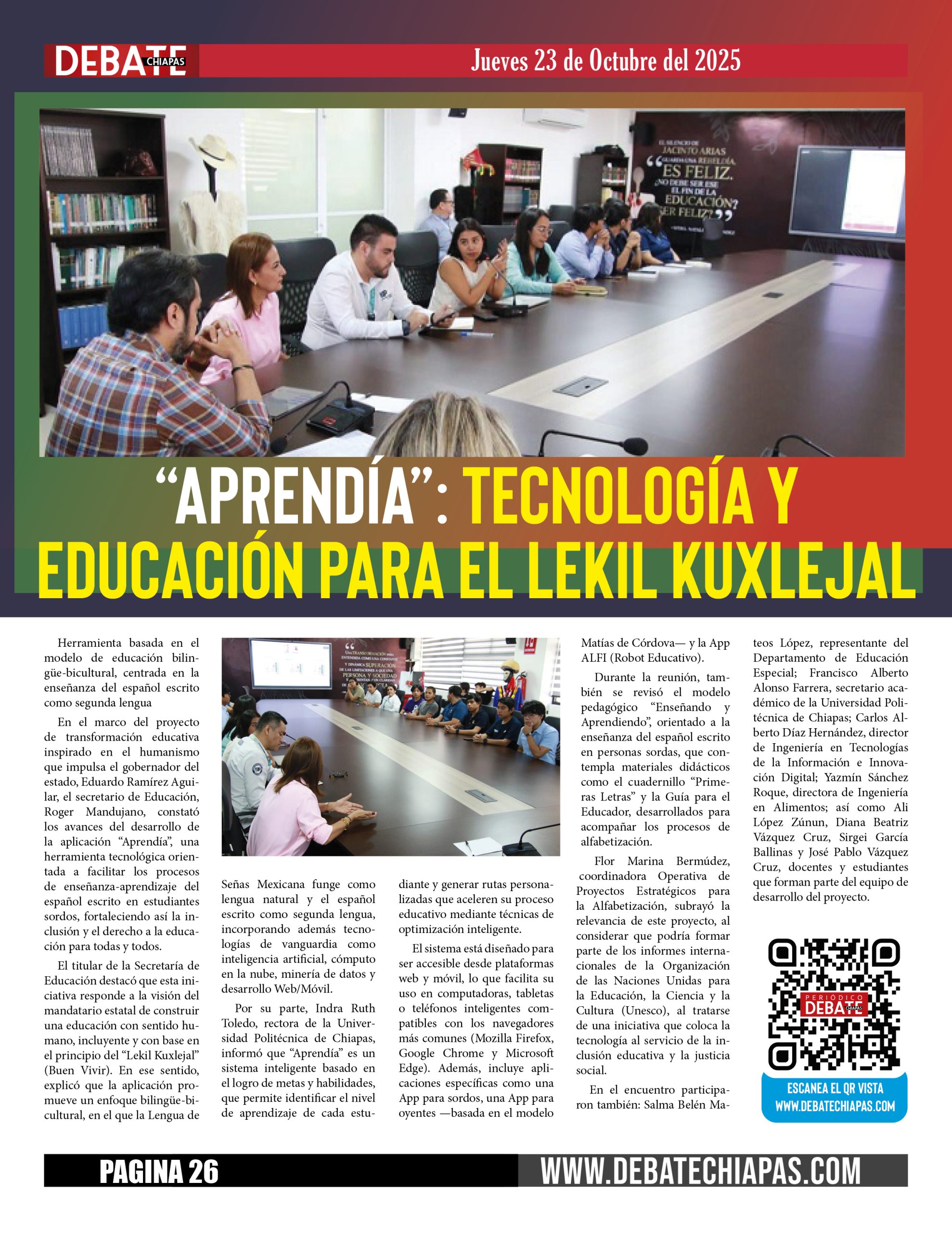 El titular de la Secretaría de Educación destacó que esta iniciativa responde a la visión del mandatario estatal de construir una educación con sentido humano, incluyente y con base en el principio del “Lekil Kuxlejal” (Buen Vivir). En ese sentido, explicó que la aplicación promueve un enfoque bilingüe-bicultural, en el que la Lengua de Señas Mexicana funge como lengua natural y el español escrito como segunda lengua, incorporando además tecnologías de vanguardia como inteligencia artificial, cómputo en la nube, minería de datos y desarrollo Web/Móvil.
