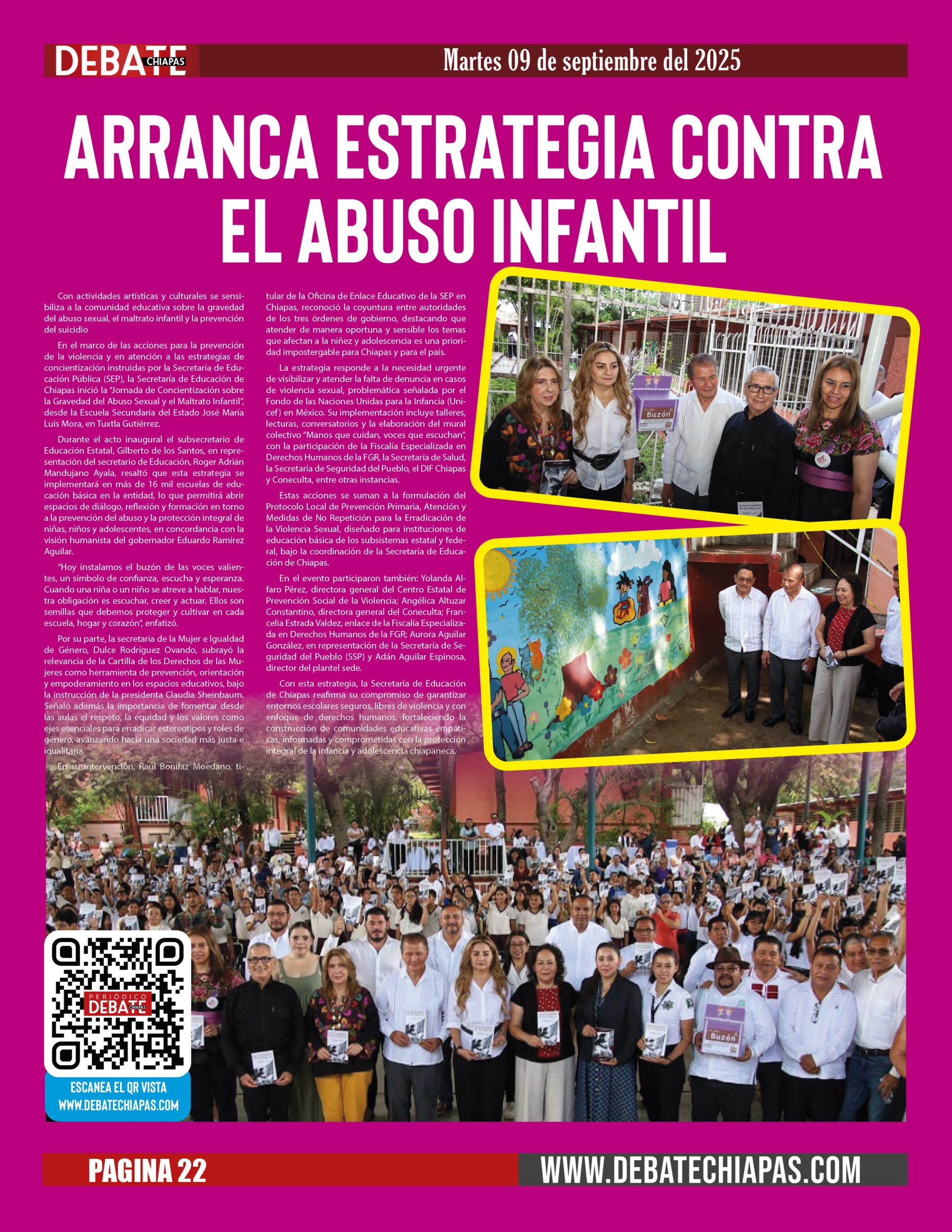 La estrategia responde a la necesidad urgente de visibilizar y atender la falta de denuncia en casos de violencia sexual, problemática señalada por el Fondo de las Naciones Unidas para la Infancia (Unicef) en México. Su implementación incluye talleres, lecturas, conversatorios y la elaboración del mural colectivo “Manos que cuidan, voces que escuchan”, con la participación de la Fiscalía Especializada en Derechos Humanos de la FGR, la Secretaría de Salud, la Secretaría de Seguridad del Pueblo, el DIF Chiapas y Coneculta, entre otras instancias.