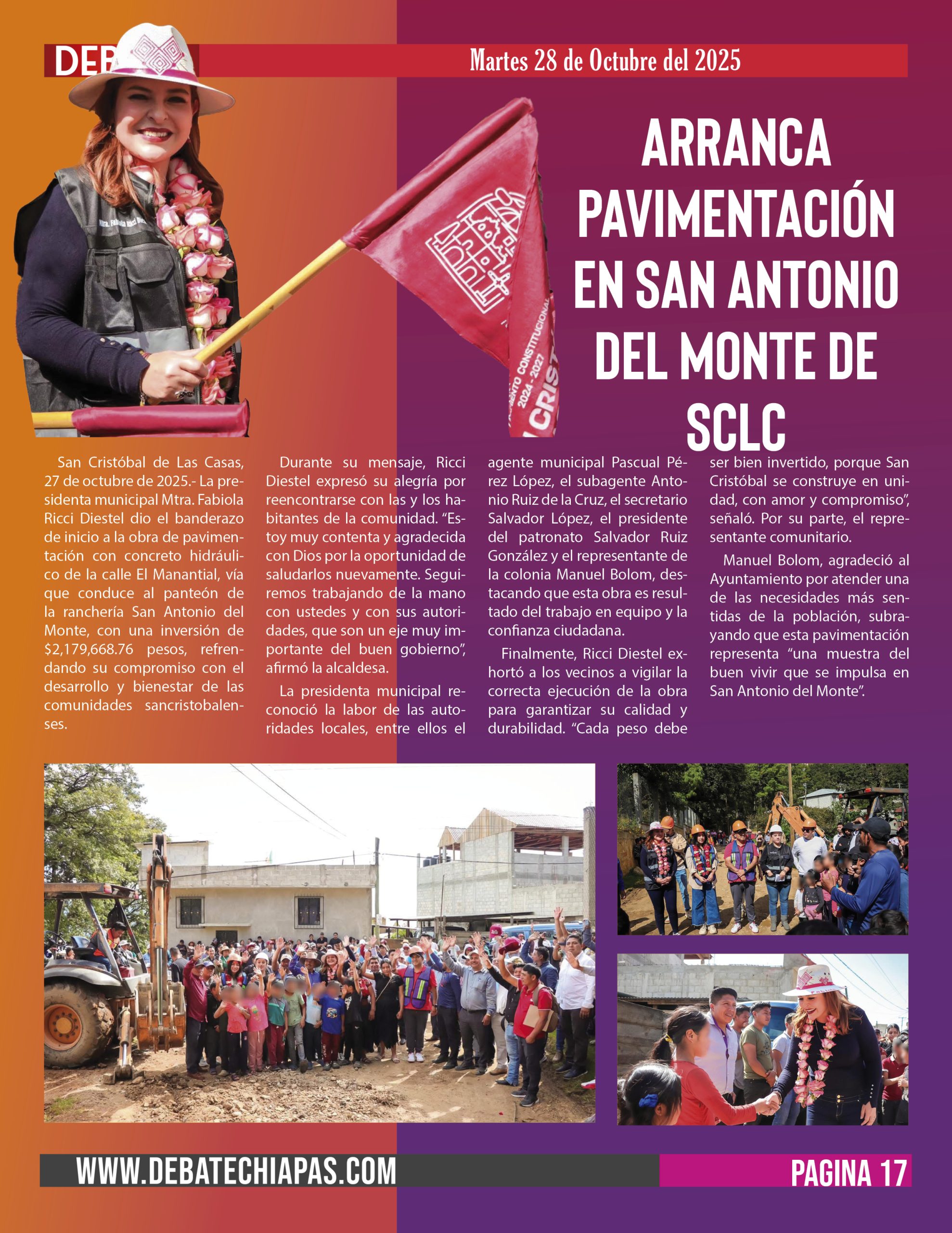 San Cristóbal de Las Casas, 27 de octubre de 2025.- La presidenta municipal Mtra. Fabiola Ricci Diestel dio el banderazo de inicio a la obra de pavimentación con concreto hidráulico de la calle El Manantial, vía que conduce al panteón de la ranchería San Antonio del Monte, con una inversión de $2,179,668.76 pesos, refrendando su compromiso con el desarrollo y bienestar de las comunidades sancristobalenses.