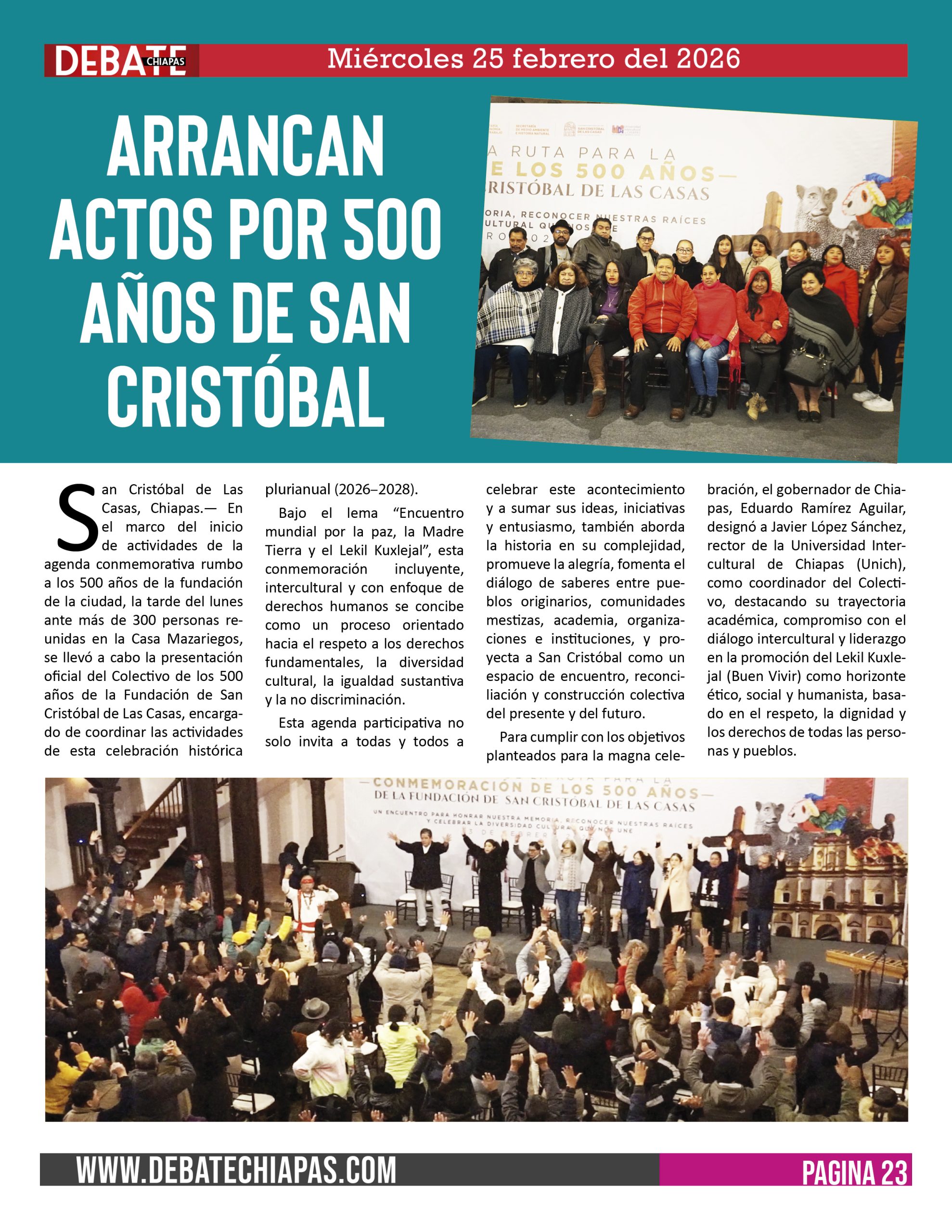 Esta agenda participativa no solo invita a todas y todos a celebrar este acontecimiento y a sumar sus ideas, iniciativas y entusiasmo, también aborda la historia en su complejidad, promueve la alegría, fomenta el diálogo de saberes entre pueblos originarios, comunidades mestizas, academia, organizaciones e instituciones, y proyecta a San Cristóbal como un espacio de encuentro, reconciliación y construcción colectiva del presente y del futuro.
