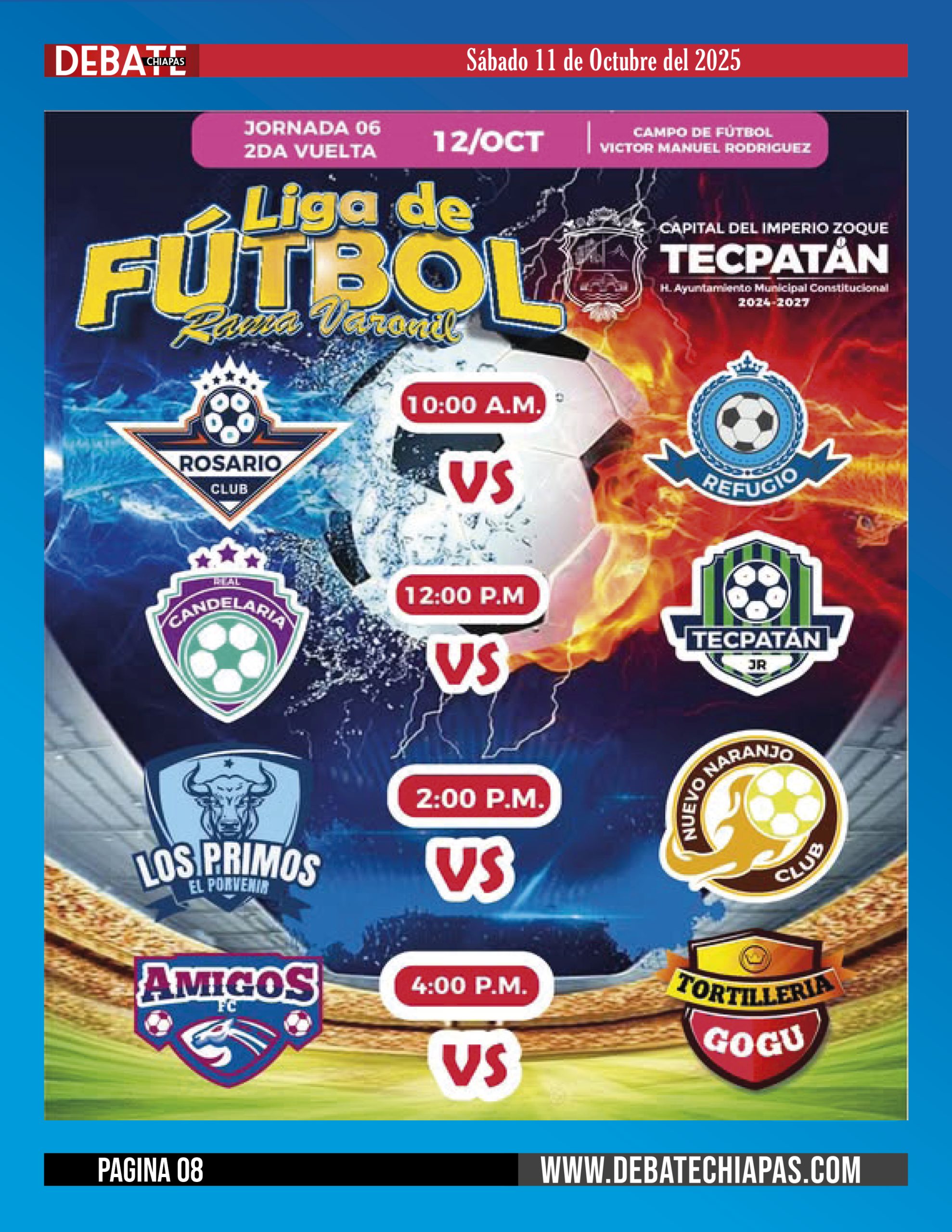 El Ayuntamiento Municipal de Tecpatán y la Dirección de Deportes invitan al público en general a disfrutar de los emocionantes encuentros de la Jornada 6, Segunda Vuelta de la Liga de Fútbol Municipal de Tecpatán.