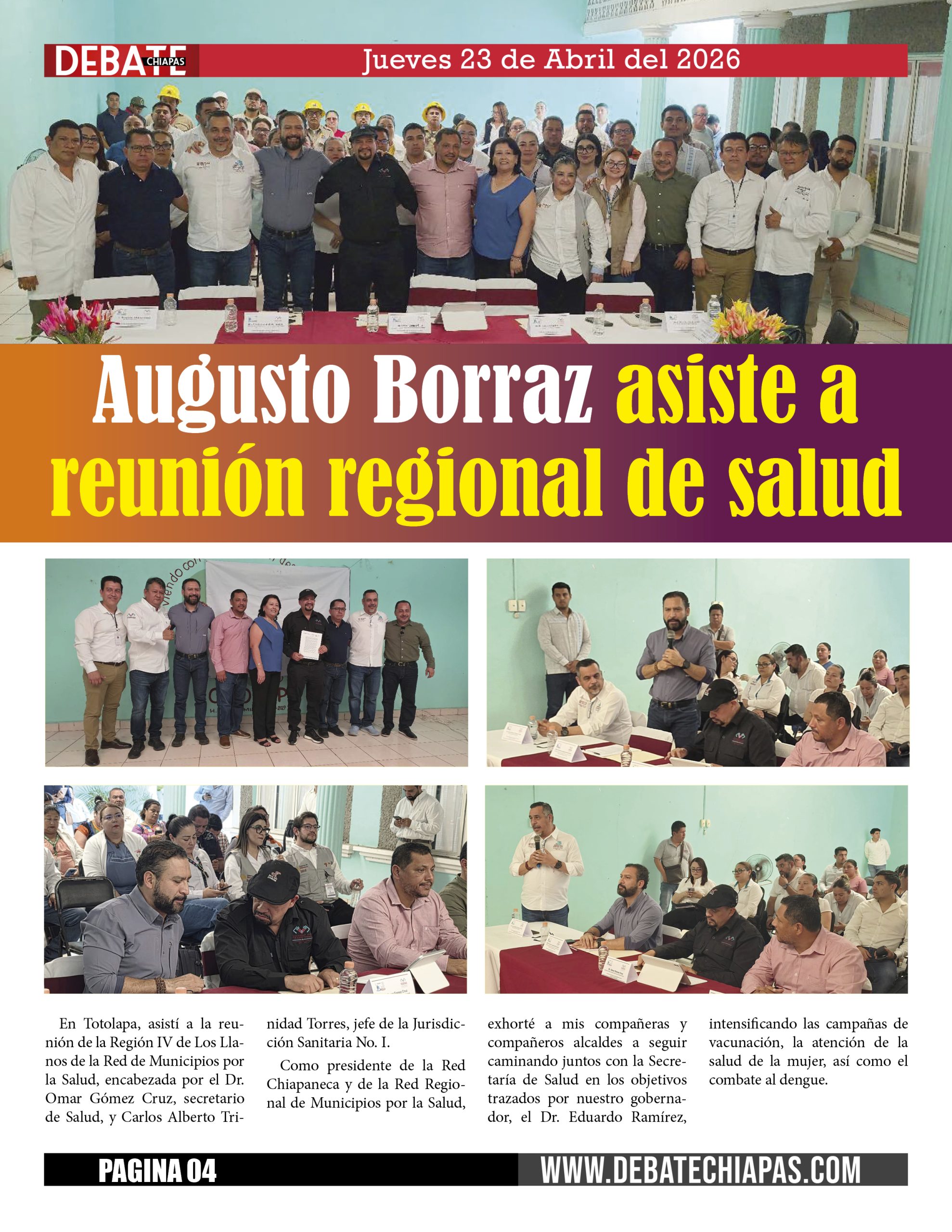 En Totolapa, asistí a la reunión de la Región IV de Los Llanos de la Red de Municipios por la Salud, encabezada por el Dr. Omar Gómez Cruz, secretario de Salud, y Carlos Alberto Trinidad Torres, jefe de la Jurisdicción Sanitaria No. I.