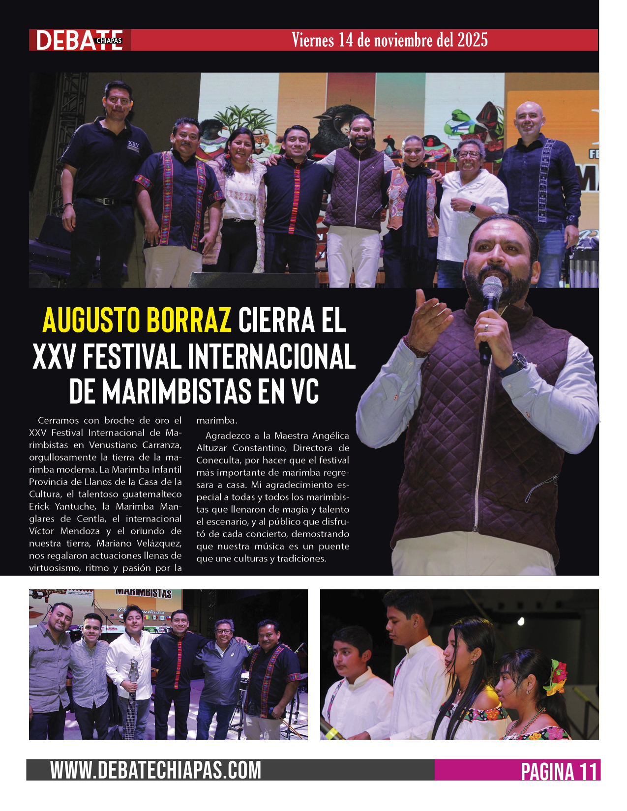 Agradezco a la Maestra Angélica Altuzar Constantino, Directora de Coneculta, por hacer que el festival más importante de marimba regresara a casa. Mi agradecimiento especial a todas y todos los marimbistas que llenaron de magia y talento el escenario, y al público que disfrutó de cada concierto, demostrando que nuestra música es un puente que une culturas y tradiciones.