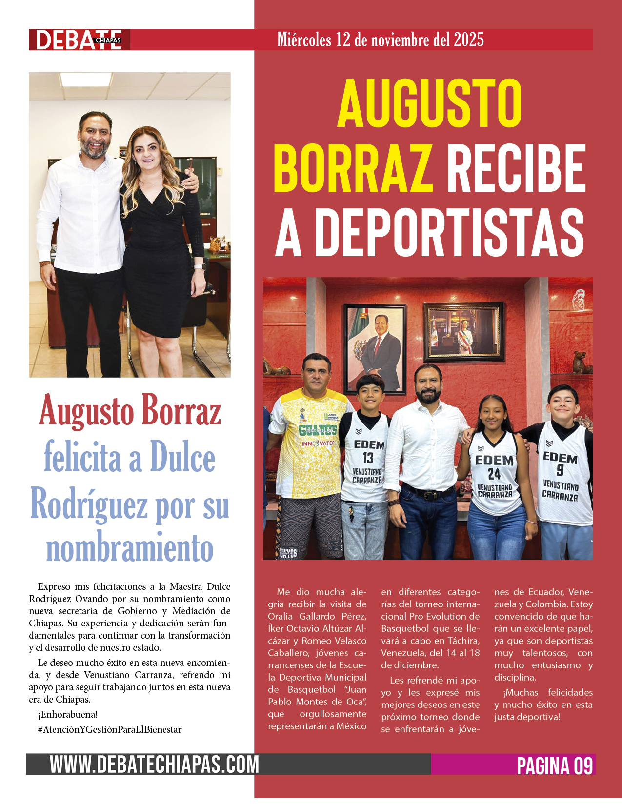 Me dio mucha alegría recibir la visita de Oralia Gallardo Pérez, Íker Octavio Altúzar Alcázar y Romeo Velasco Caballero, jóvenes carrancenses de la Escuela Deportiva Municipal de Basquetbol «Juan Pablo Montes de Oca», que orgullosamente representarán a México en diferentes categorías del torneo internacional Pro Evolution de Basquetbol que se llevará a cabo en Táchira, Venezuela, del 14 al 18 de diciembre.