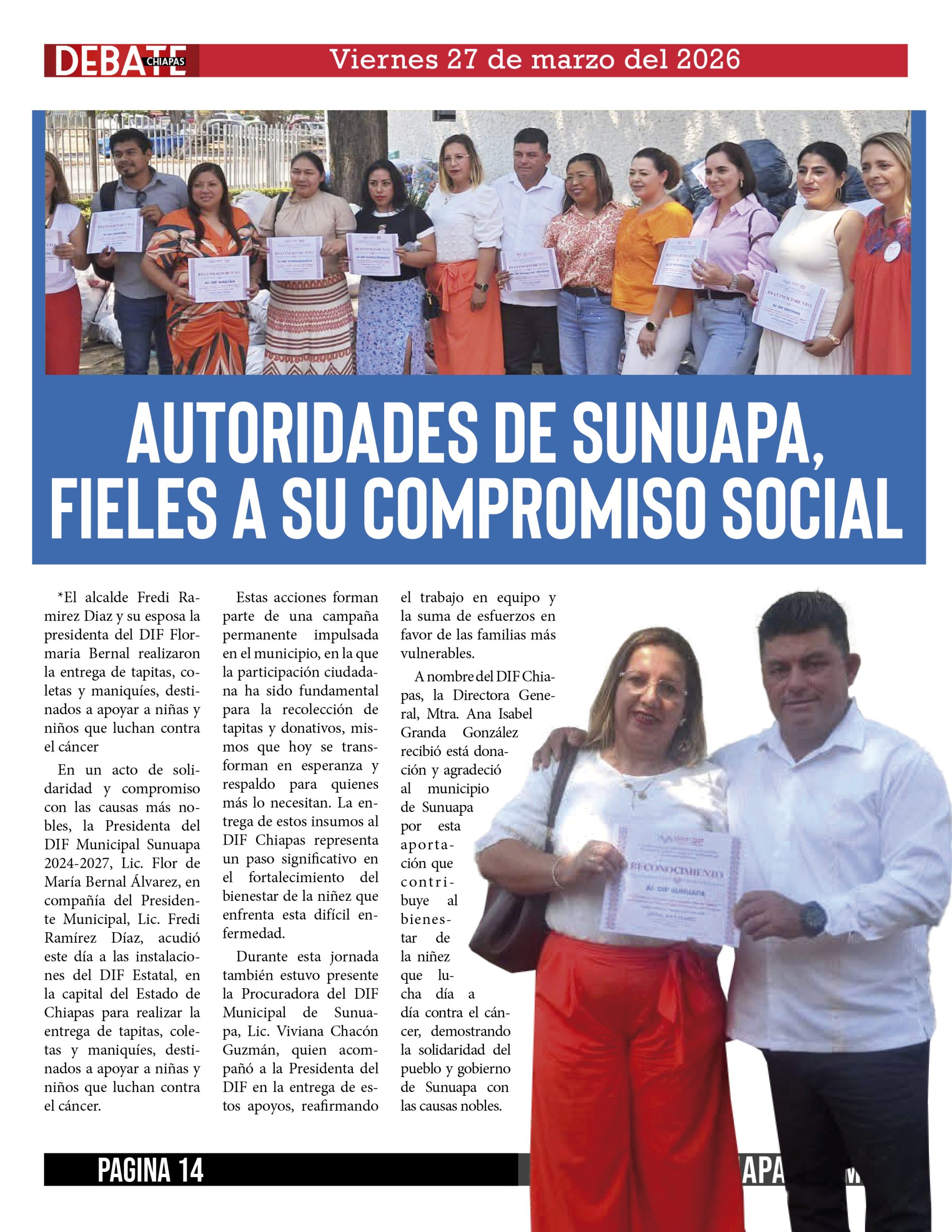 A nombre del DIF Chiapas, la Directora General, Mtra. Ana Isabel Granda González recibió está donación y agradeció al municipio de Sunuapa por esta aportación que contribuye al bienestar de la niñez que lucha día a día contra el cáncer, demostrando la solidaridad del pueblo y gobierno de Sunuapa con las causas nobles.