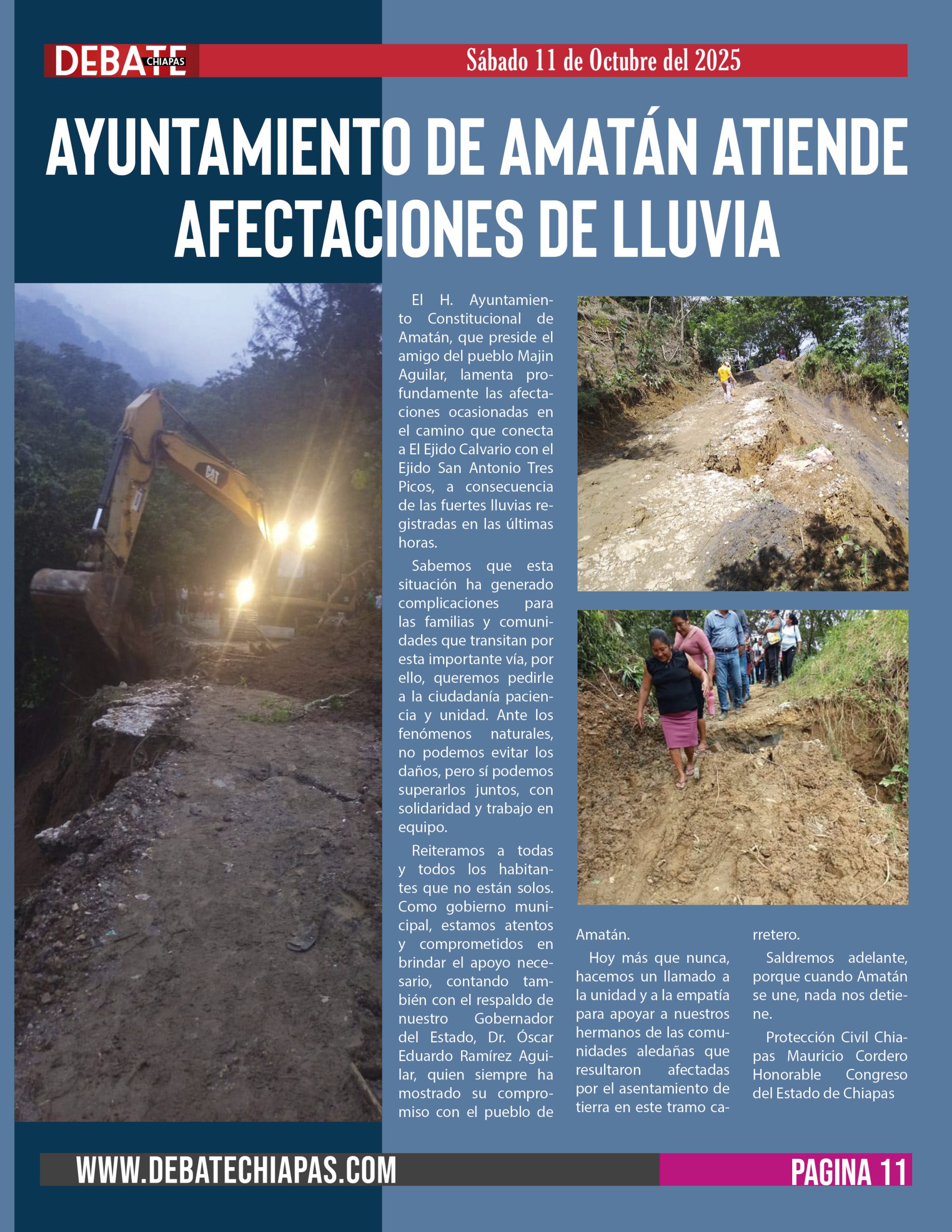 El H. Ayuntamiento Constitucional de Amatán, que preside el amigo del pueblo Majin Aguilar, lamenta profundamente las afectaciones ocasionadas en el camino que conecta a El Ejido Calvario con el Ejido San Antonio Tres Picos, a consecuencia de las fuertes lluvias registradas en las últimas horas.