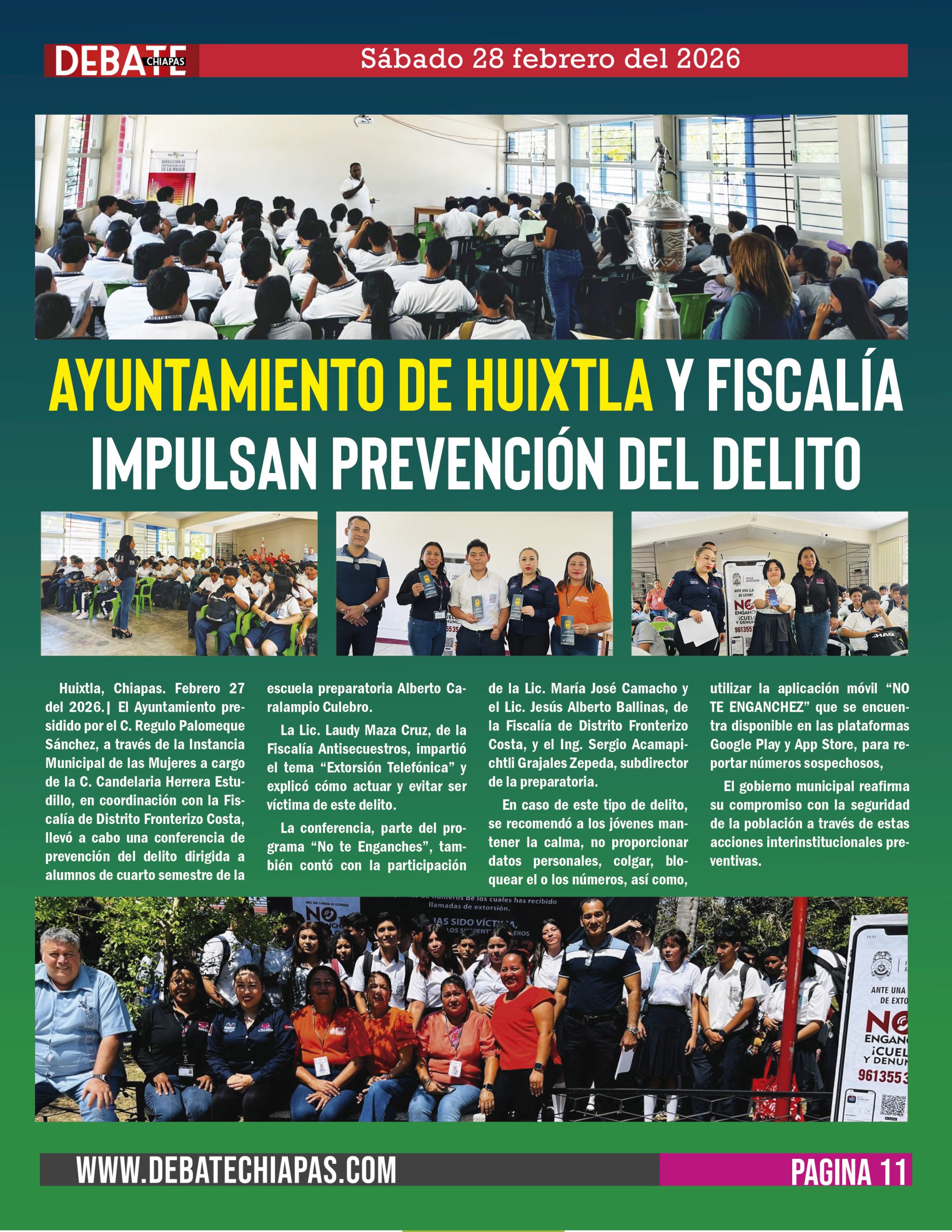 Huixtla, Chiapas. Febrero 27 del 2026.| El Ayuntamiento presidido por el C. Regulo Palomeque Sánchez, a través de la Instancia Municipal de las Mujeres a cargo de la C. Candelaria Herrera Estudillo, en coordinación con la Fiscalía de Distrito Fronterizo Costa, llevó a cabo una conferencia de prevención del delito dirigida a alumnos de cuarto semestre de la escuela preparatoria Alberto Caralampio Culebro.