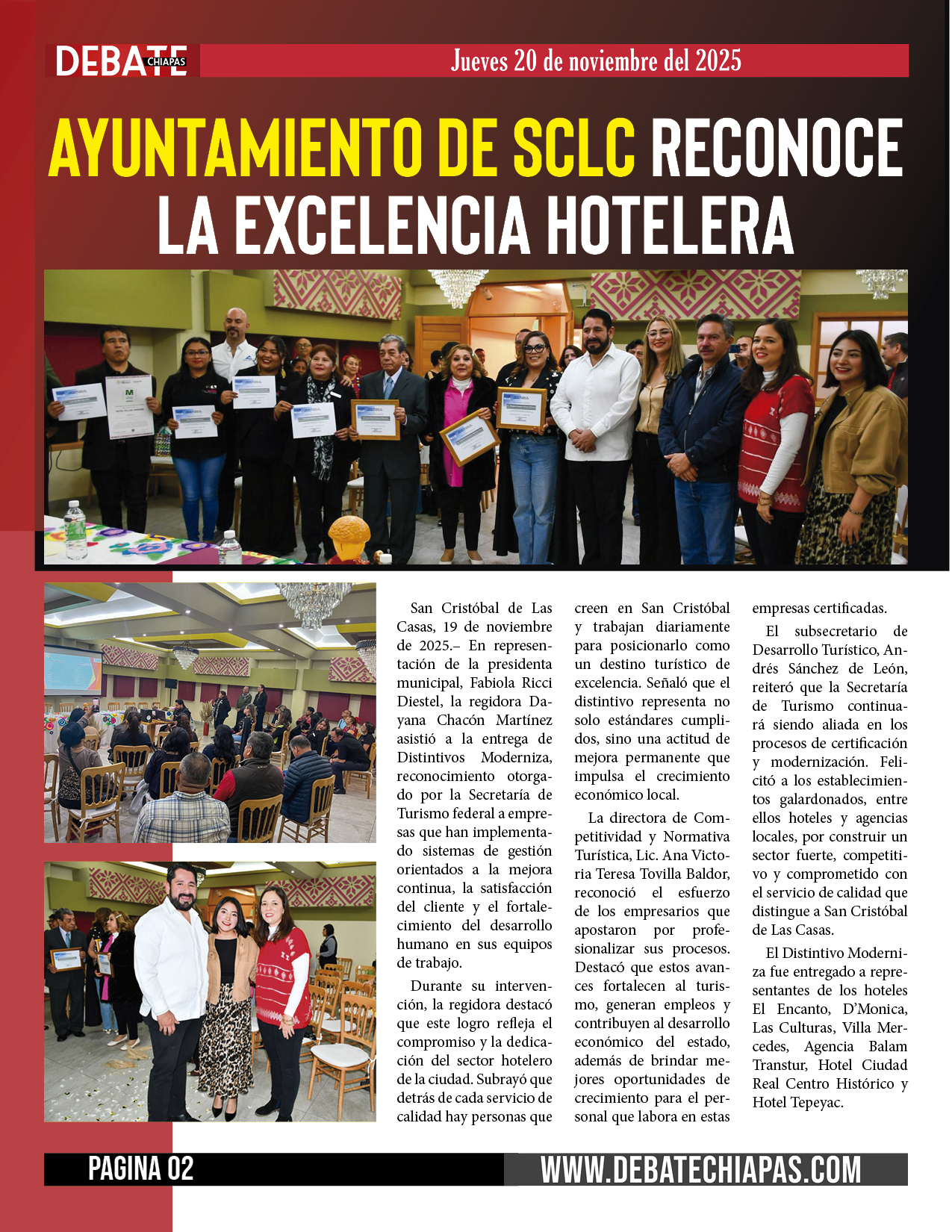 San Cristóbal de Las Casas, 19 de noviembre de 2025.– En representación de la presidenta municipal, Fabiola Ricci Diestel, la regidora Dayana Chacón Martínez asistió a la entrega de Distintivos Moderniza, reconocimiento otorgado por la Secretaría de Turismo federal a empresas que han implementado sistemas de gestión orientados a la mejora continua, la satisfacción del cliente y el fortalecimiento del desarrollo humano en sus equipos de trabajo.