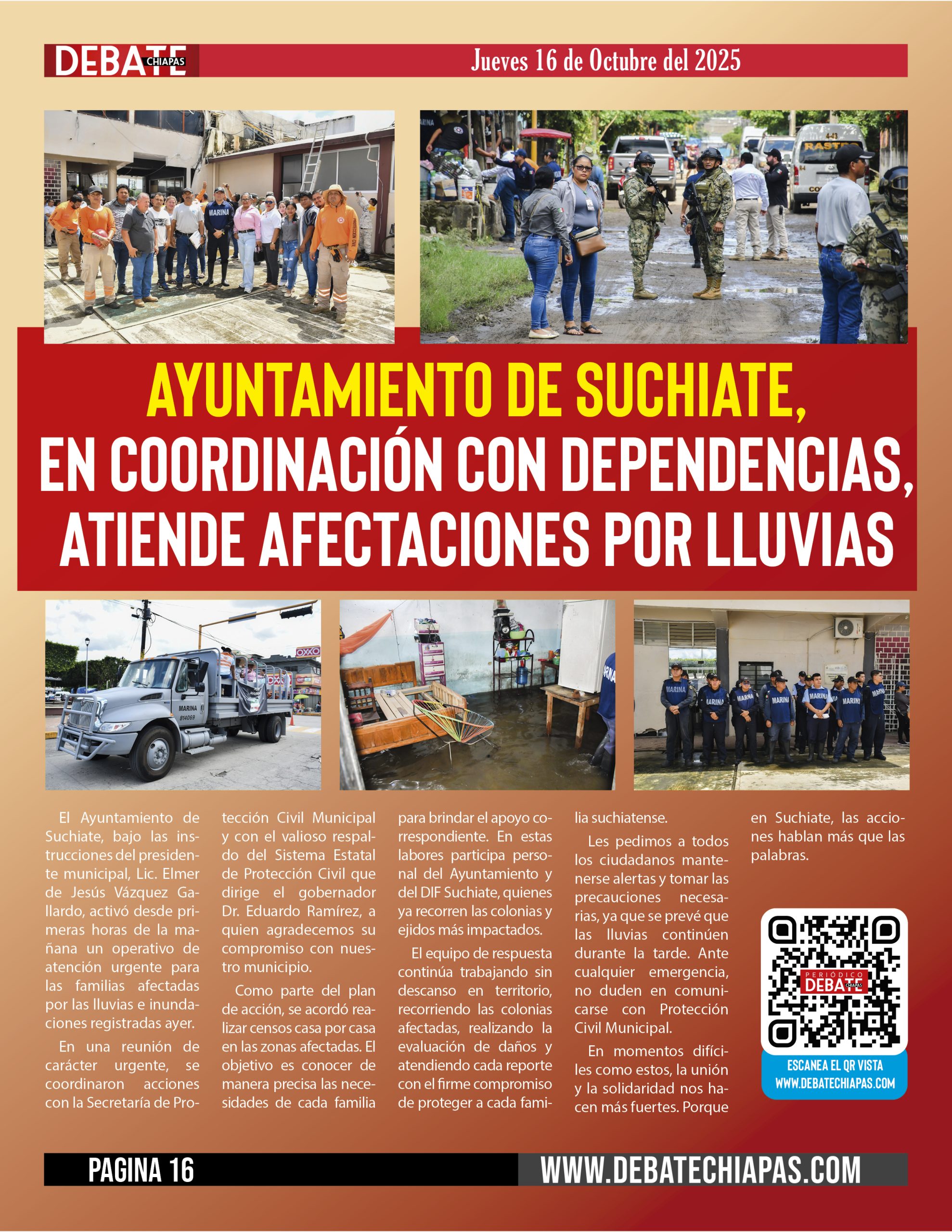 El Ayuntamiento de Suchiate, bajo las instrucciones del presidente municipal, Lic. Elmer de Jesús Vázquez Gallardo, activó desde primeras horas de la mañana un operativo de atención urgente para las familias afectadas por las lluvias e inundaciones registradas ayer.