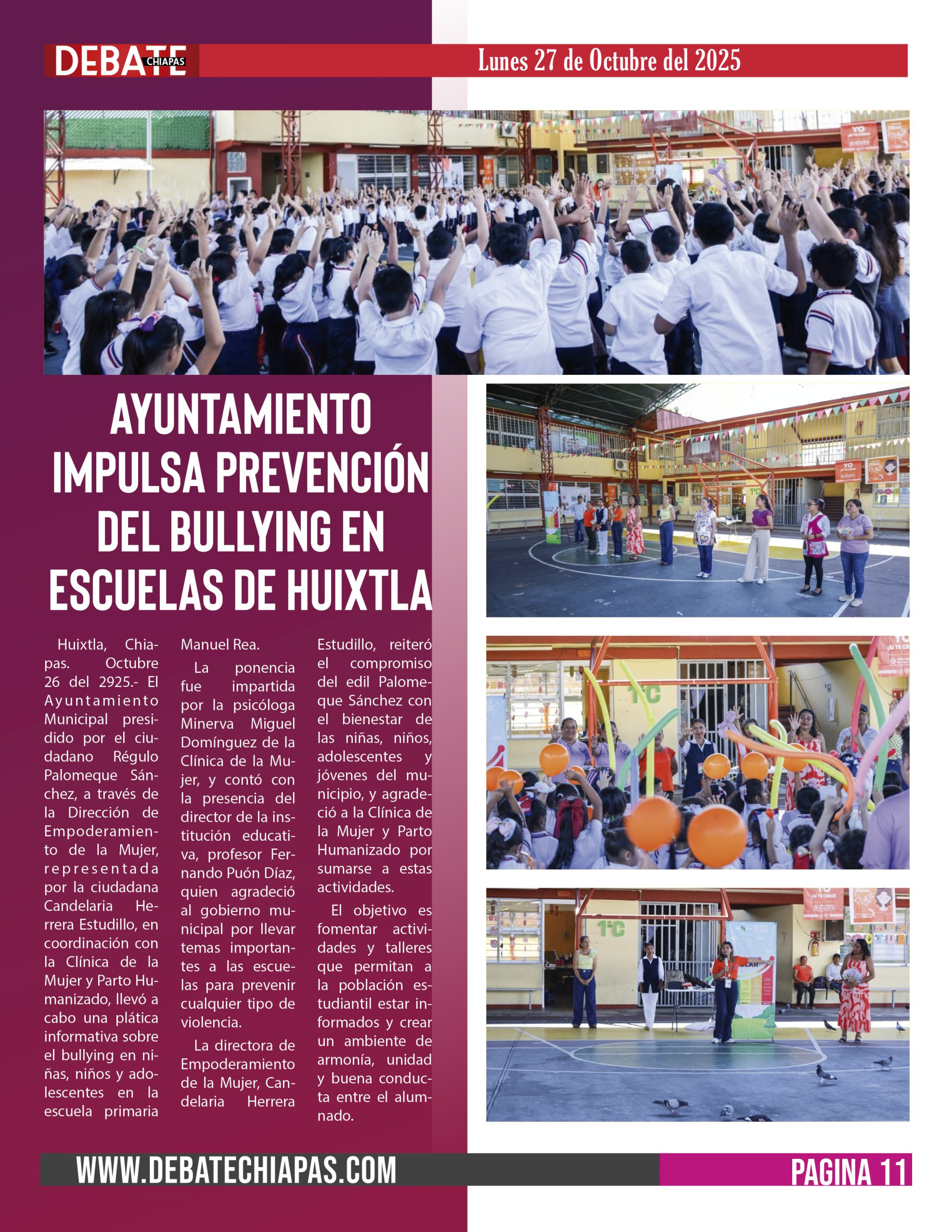 Huixtla, Chiapas. Octubre 26 del 2925.- El Ayuntamiento Municipal presidido por el ciudadano Régulo Palomeque Sánchez, a través de la Dirección de Empoderamiento de la Mujer, representada por la ciudadana Candelaria Herrera Estudillo, en coordinación con la Clínica de la Mujer y Parto Humanizado, llevó a cabo una plática informativa sobre el bullying en niñas, niños y adolescentes en la escuela primaria Manuel Rea.