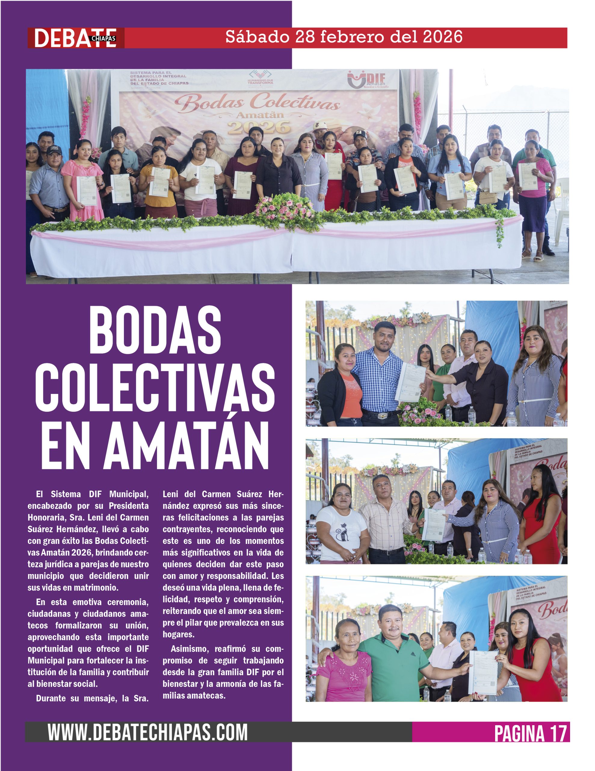 El Sistema DIF Municipal, encabezado por su Presidenta Honoraria, Sra. Leni del Carmen Suárez Hernández, llevó a cabo con gran éxito las Bodas Colectivas Amatán 2026, brindando certeza jurídica a parejas de nuestro municipio que decidieron unir sus vidas en matrimonio.