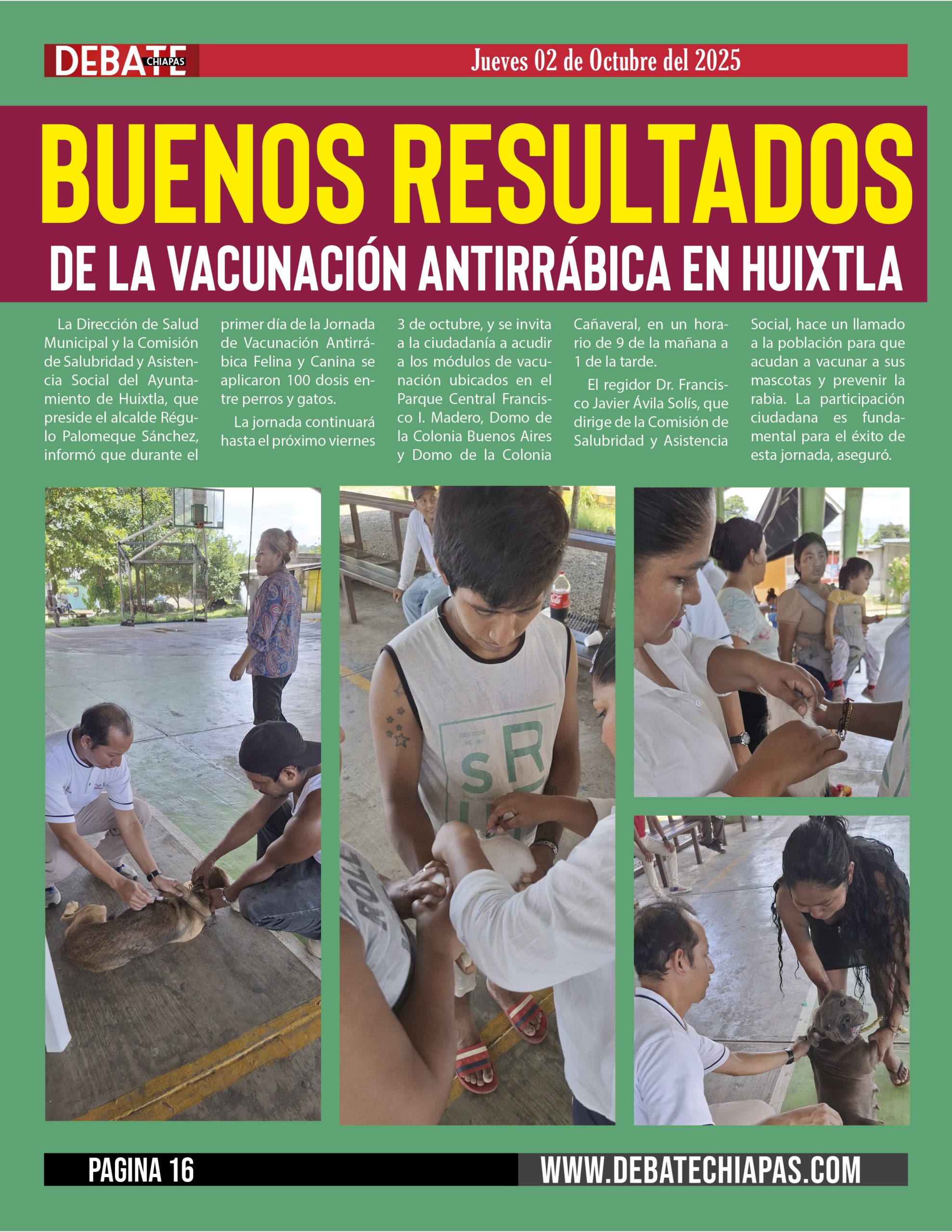 La Dirección de Salud Municipal y la Comisión de Salubridad y Asistencia Social del Ayuntamiento de Huixtla, que preside el alcalde Régulo Palomeque Sánchez, informó que durante el primer día de la Jornada de Vacunación Antirrábica Felina y Canina se aplicaron 100 dosis entre perros y gatos.