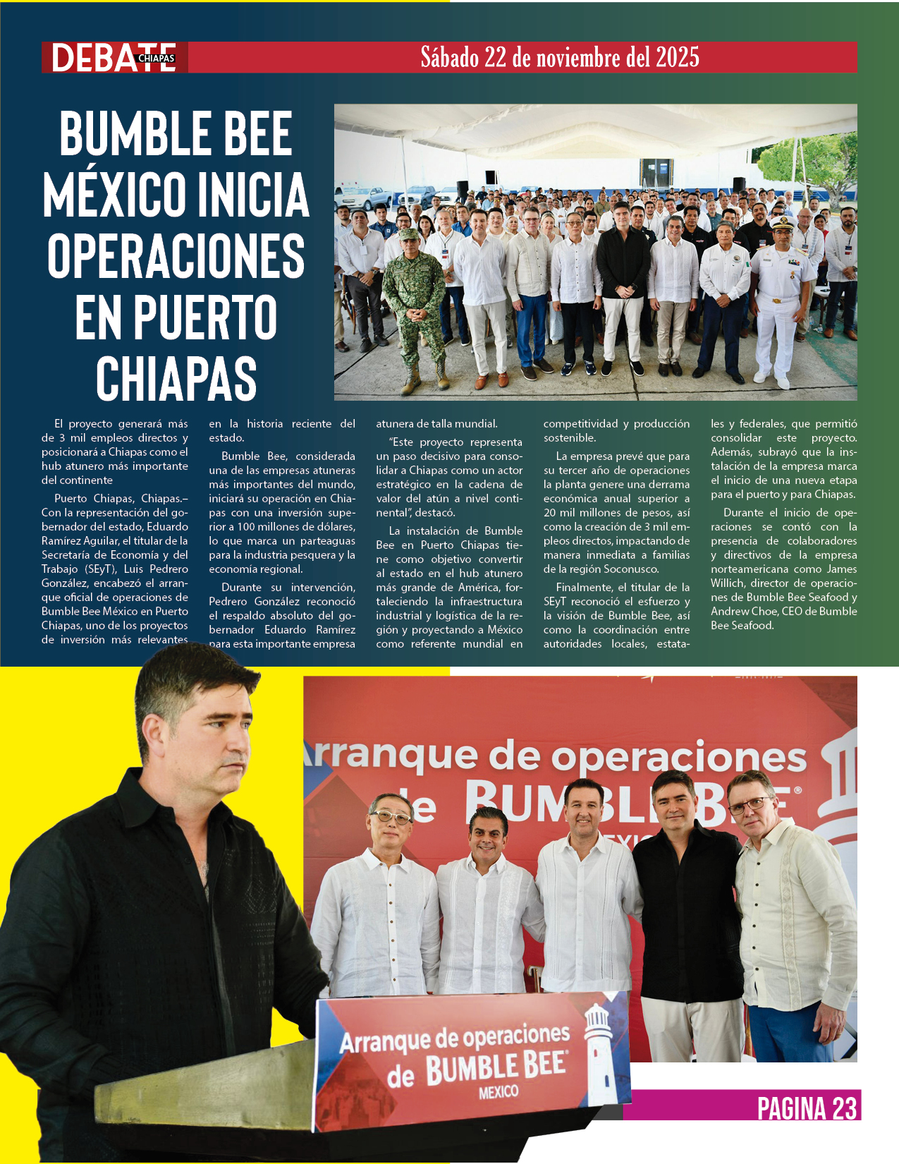 Puerto Chiapas, Chiapas.– Con la representación del gobernador del estado, Eduardo Ramírez Aguilar, el titular de la Secretaría de Economía y del Trabajo (SEyT), Luis Pedrero González, encabezó el arranque oficial de operaciones de Bumble Bee México en Puerto Chiapas, uno de los proyectos de inversión más relevantes en la historia reciente del estado.