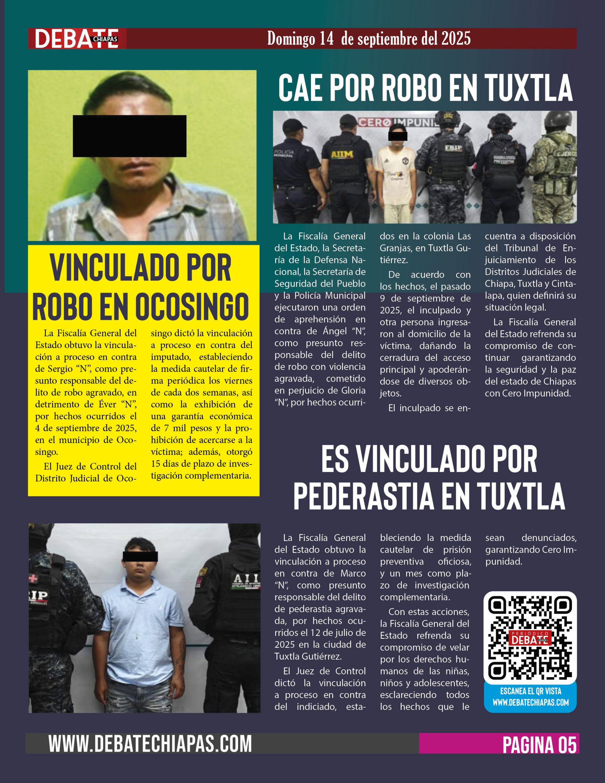 La Fiscalía General del Estado, la Secretaría de la Defensa Nacional, la Secretaría de Seguridad del Pueblo y la Policía Municipal ejecutaron una orden de aprehensión en contra de Ángel “N”, como presunto responsable del delito de robo con violencia agravada, cometido en perjuicio de Gloria “N”, por hechos ocurridos en la colonia Las Granjas, en Tuxtla Gutiérrez.