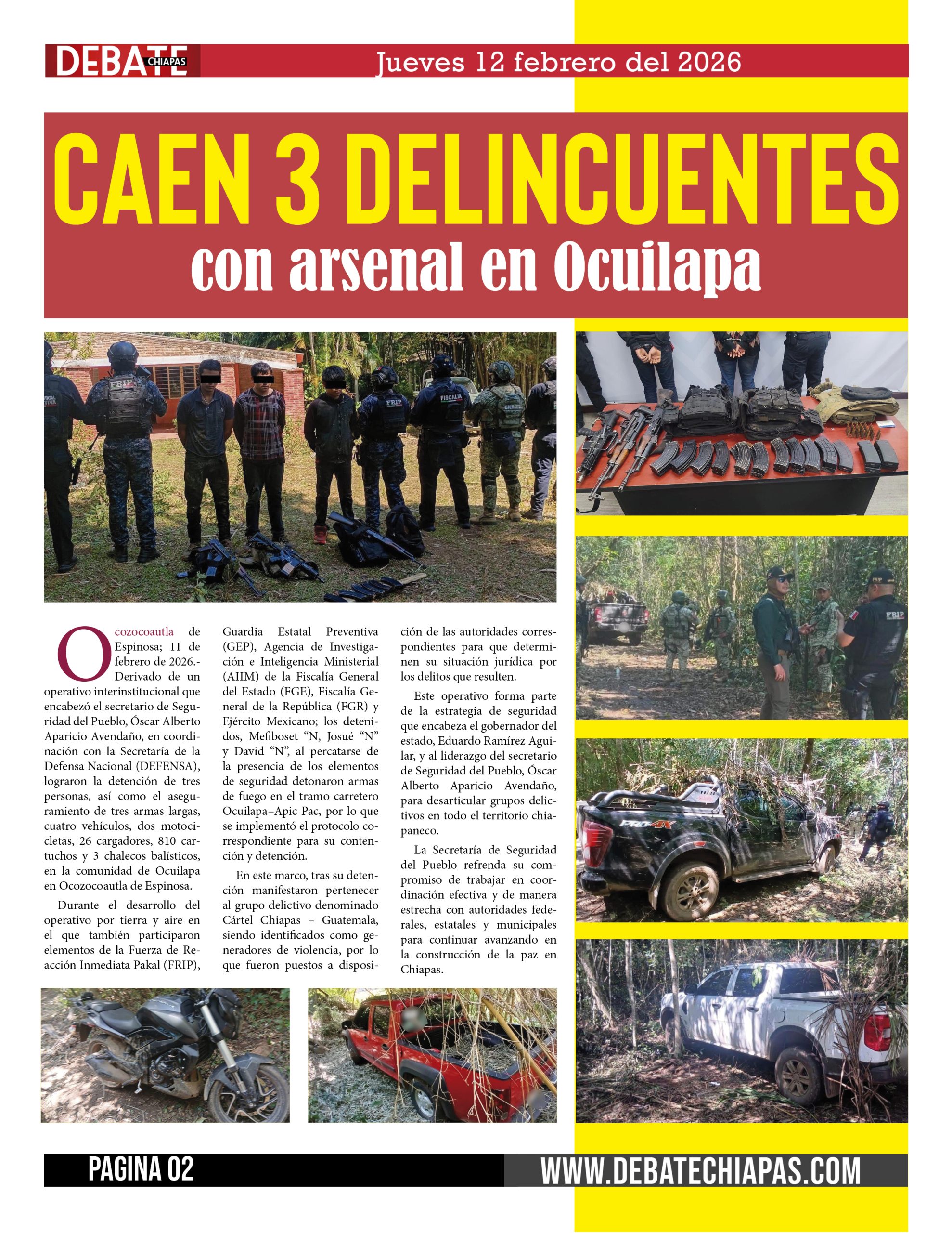Ocozocoautla de Espinosa; 11 de febrero de 2026.- Derivado de un operativo interinstitucional que encabezó el secretario de Seguridad del Pueblo, Óscar Alberto Aparicio Avendaño, en coordinación con la Secretaría de la Defensa Nacional (DEFENSA), lograron la detención de tres personas, así como el aseguramiento de tres armas largas, cuatro vehículos, dos motocicletas, 26 cargadores, 810 cartuchos y 3 chalecos balísticos, en la comunidad de Ocuilapa en Ocozocoautla de Espinosa.