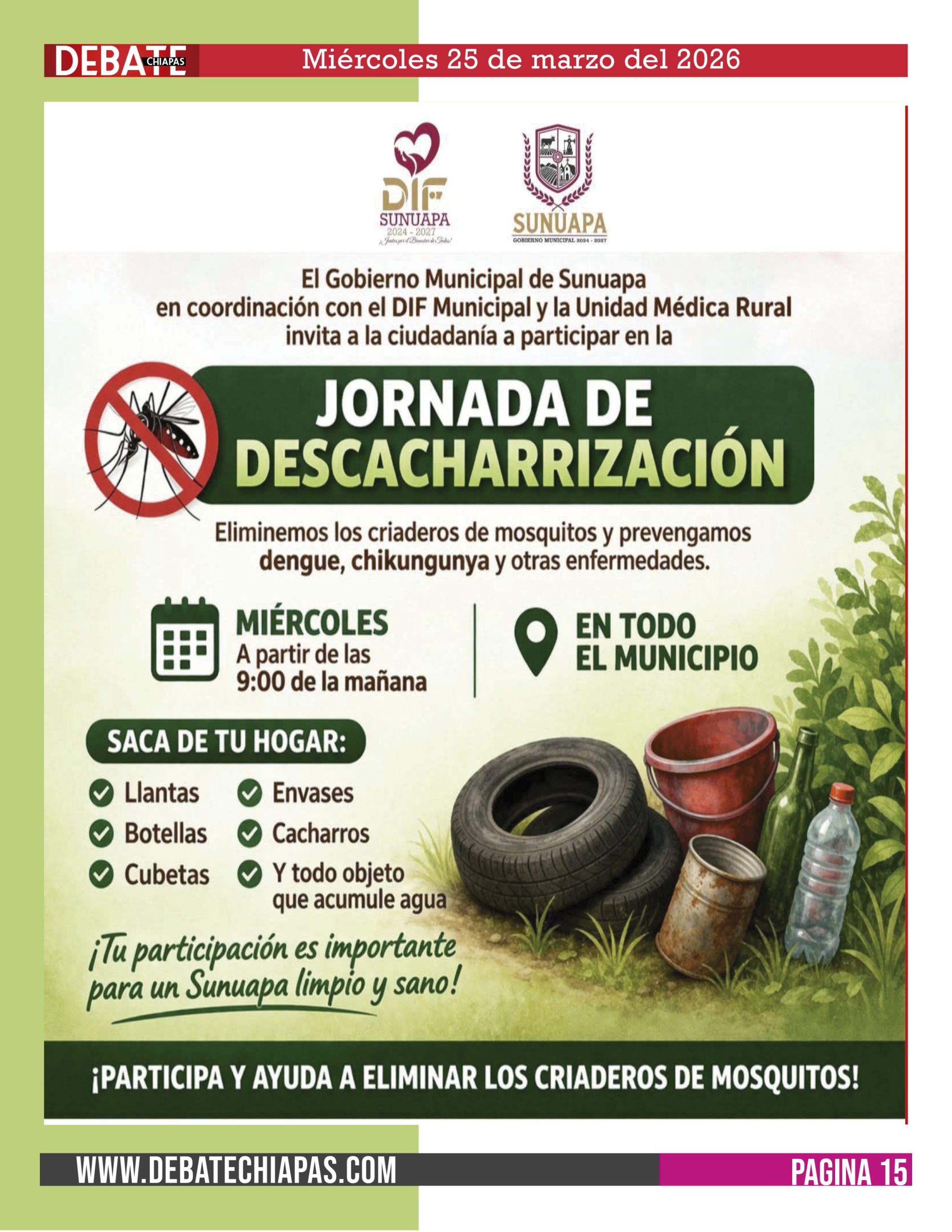 Que este próximo miércoles 25 de marzo se llevará a cabo una jornada de descacharrización en el municipio, iniciando a partir de las 9:00 de la mañana.