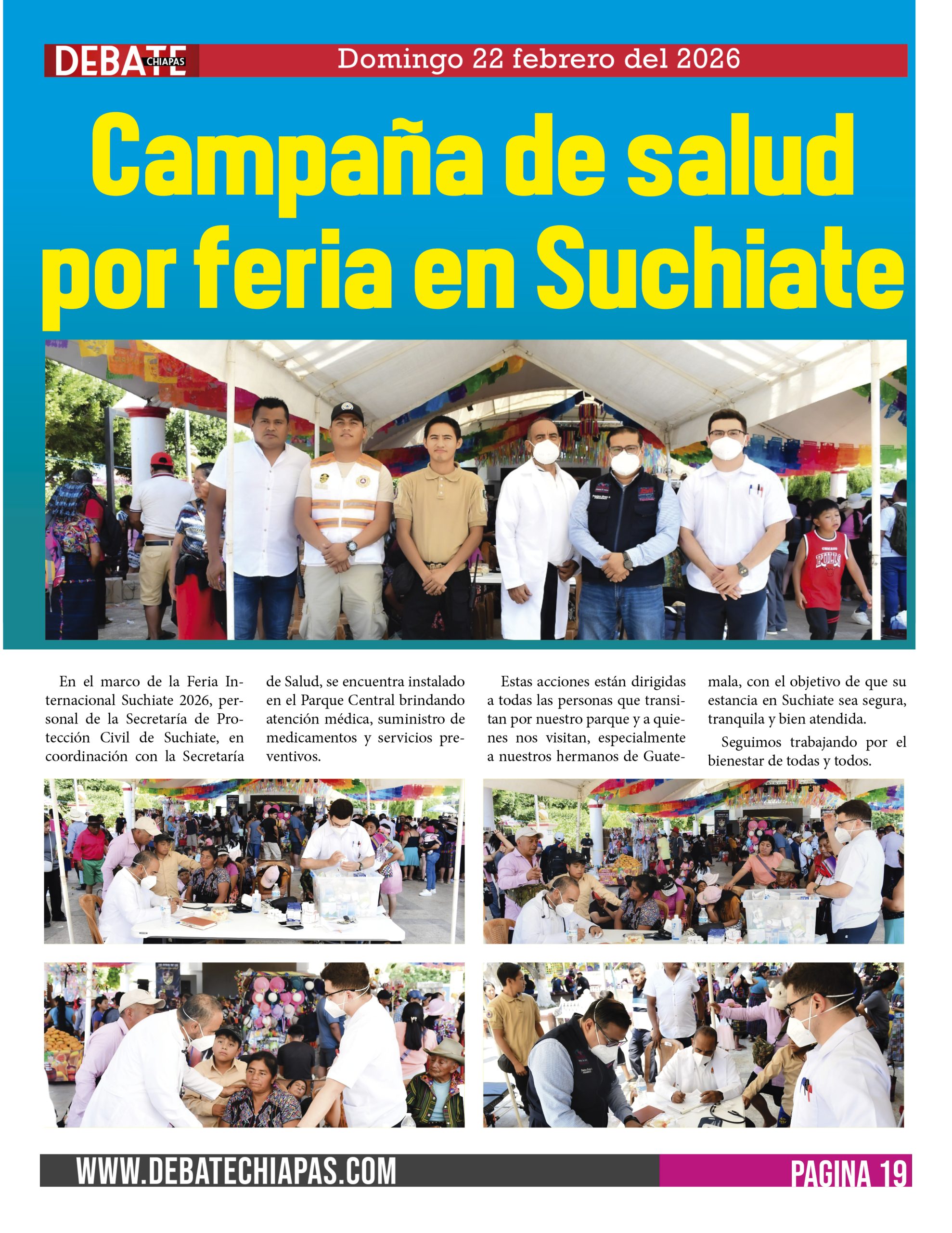 En el marco de la Feria Internacional Suchiate 2026, personal de la Secretaría de Protección Civil de Suchiate, en coordinación con la Secretaría de Salud, se encuentra instalado en el Parque Central brindando atención médica, suministro de medicamentos y servicios preventivos.