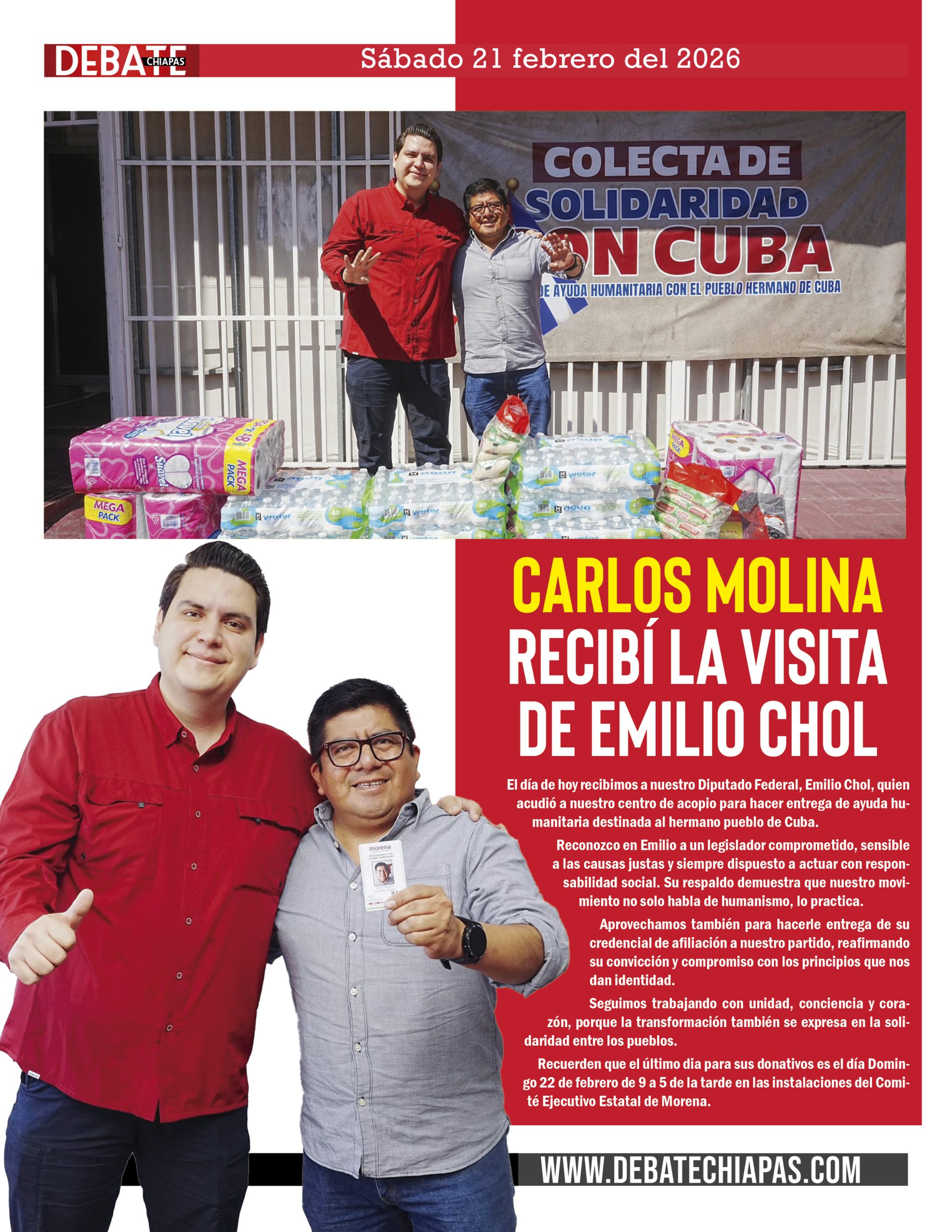 El día de hoy recibimos a nuestro Diputado Federal, Emilio Chol, quien acudió a nuestro centro de acopio para hacer entrega de ayuda humanitaria destinada al hermano pueblo de Cuba.