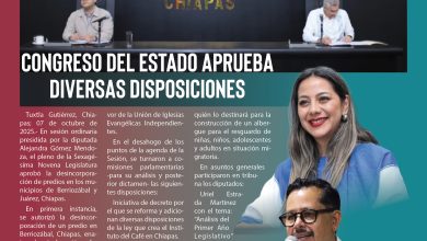 Tuxtla Gutiérrez, Chiapas; 07 de octubre de 2025.- En sesión ordinaria presidida por la diputada Alejandra Gómez Mendoza, el pleno…