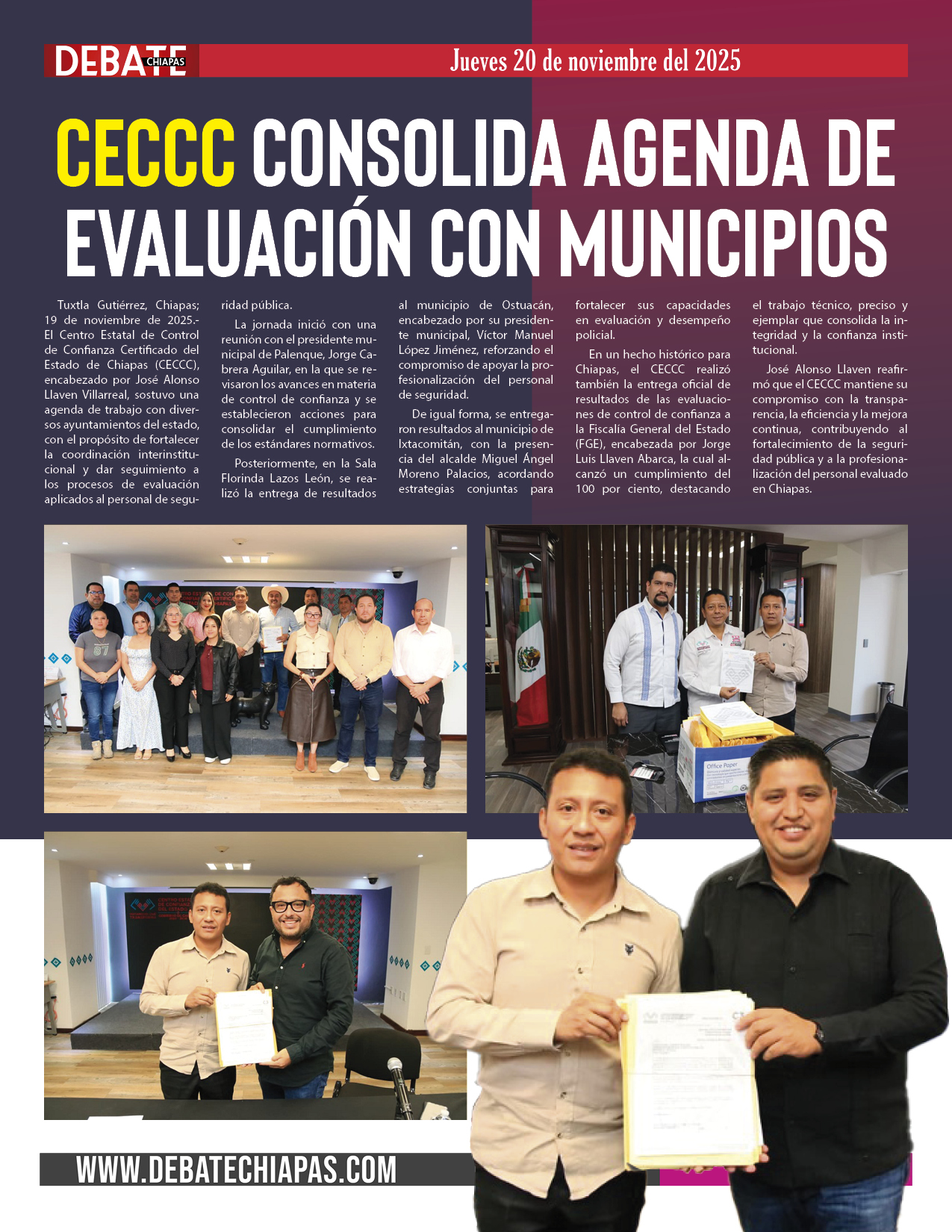 Tuxtla Gutiérrez, Chiapas; 19 de noviembre de 2025.- El Centro Estatal de Control de Confianza Certificado del Estado de Chiapas (CECCC), encabezado por José Alonso Llaven Villarreal, sostuvo una agenda de trabajo con diversos ayuntamientos del estado, con el propósito de fortalecer la coordinación interinstitucional y dar seguimiento a los procesos de evaluación aplicados al personal de seguridad pública.