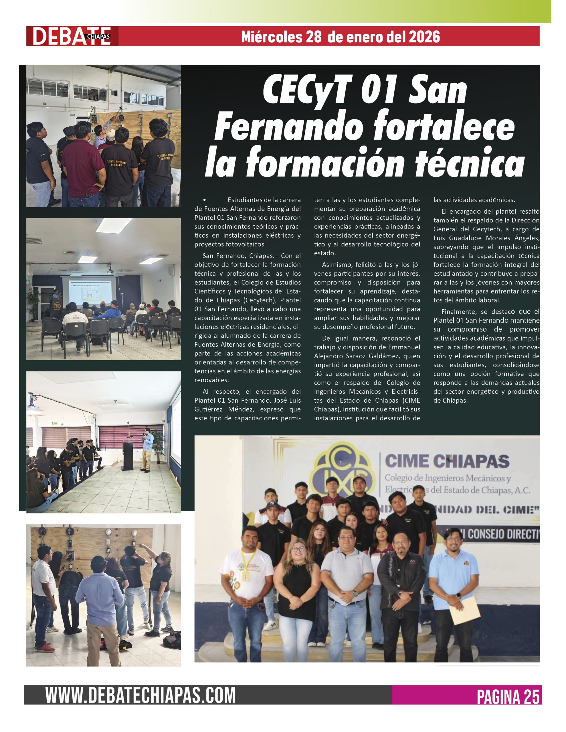 De igual manera, reconoció el trabajo y disposición de Emmanuel Alejandro Saraoz Galdámez, quien impartió la capacitación y compartió su experiencia profesional, así como el respaldo del Colegio de Ingenieros Mecánicos y Electricistas del Estado de Chiapas (CIME Chiapas), institución que facilitó sus instalaciones para el desarrollo de las actividades académicas.