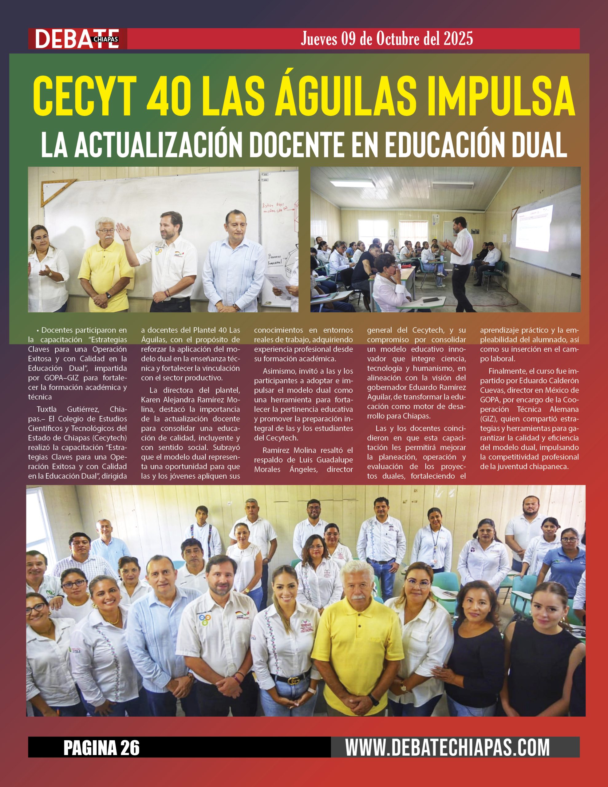 Tuxtla Gutiérrez, Chiapas.– El Colegio de Estudios Científicos y Tecnológicos del Estado de Chiapas (Cecytech) realizó la capacitación “Estrategias Claves para una Operación Exitosa y con Calidad en la Educación Dual”, dirigida a docentes del Plantel 40 Las Águilas, con el propósito de reforzar la aplicación del modelo dual en la enseñanza técnica y fortalecer la vinculación con el sector productivo.