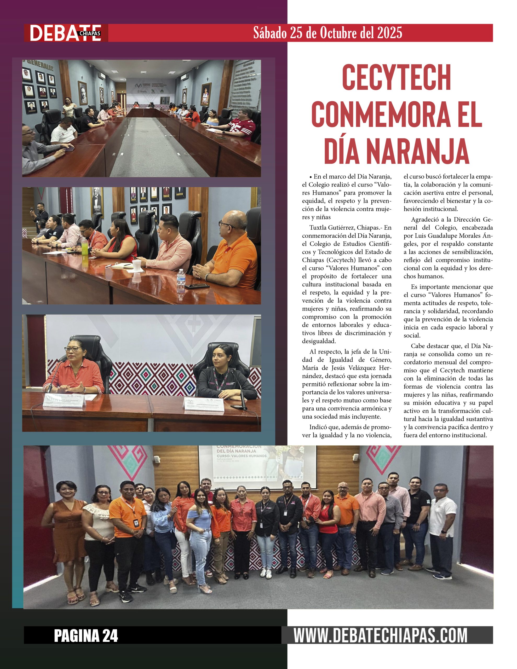 Tuxtla Gutiérrez, Chiapas.- En conmemoración del Día Naranja, el Colegio de Estudios Científicos y Tecnológicos del Estado de Chiapas (Cecytech) llevó a cabo el curso “Valores Humanos” con el propósito de fortalecer una cultura institucional basada en el respeto, la equidad y la prevención de la violencia contra mujeres y niñas, reafirmando su compromiso con la promoción de entornos laborales y educativos libres de discriminación y desigualdad.