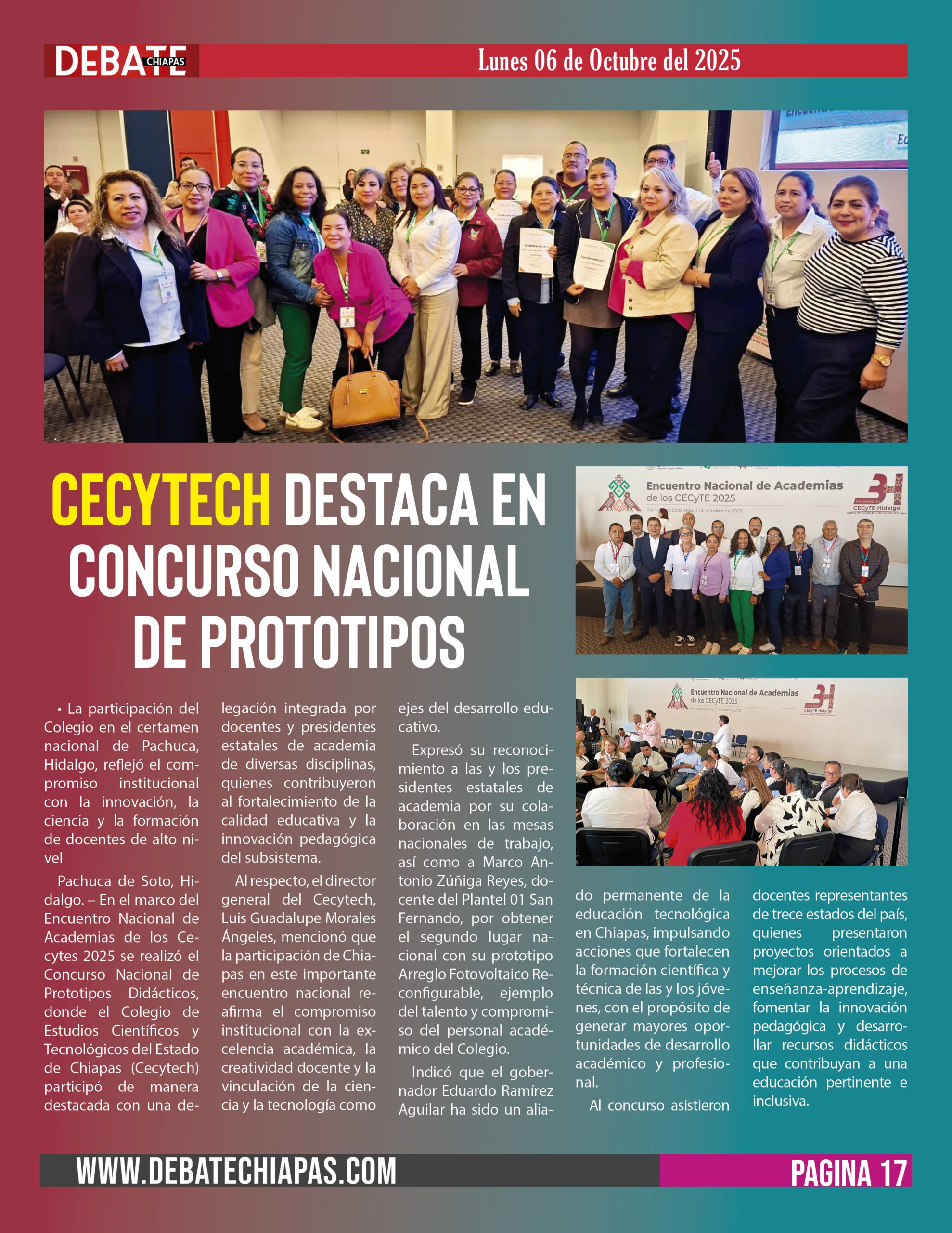 Pachuca de Soto, Hidalgo. – En el marco del Encuentro Nacional de Academias de los Cecytes 2025 se realizó el Concurso Nacional de Prototipos Didácticos, donde el Colegio de Estudios Científicos y Tecnológicos del Estado de Chiapas (Cecytech) participó de manera destacada con una delegación integrada por docentes y presidentes estatales de academia de diversas disciplinas, quienes contribuyeron al fortalecimiento de la calidad educativa y la innovación pedagógica del subsistema.