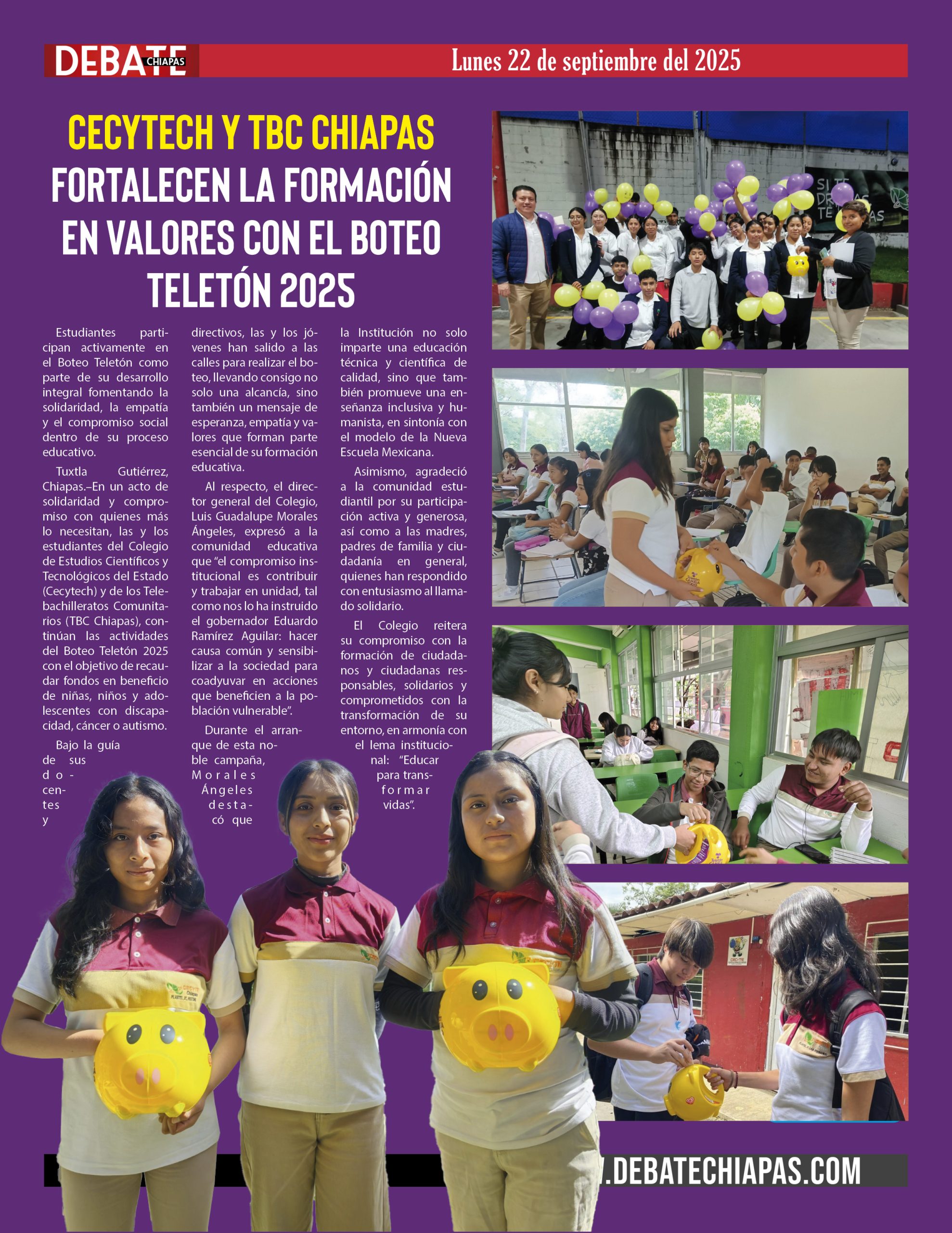 Tuxtla Gutiérrez, Chiapas. – En un acto de solidaridad y compromiso con quienes más lo necesitan, las y los estudiantes del Colegio de Estudios Científicos y Tecnológicos del Estado (Cecytech) y de los Telebachilleratos Comunitarios (TBC Chiapas), continúan las actividades del Boteo Teletón 2025 con el objetivo de recaudar fondos en beneficio de niñas, niños y adolescentes con discapacidad, cáncer o autismo.
