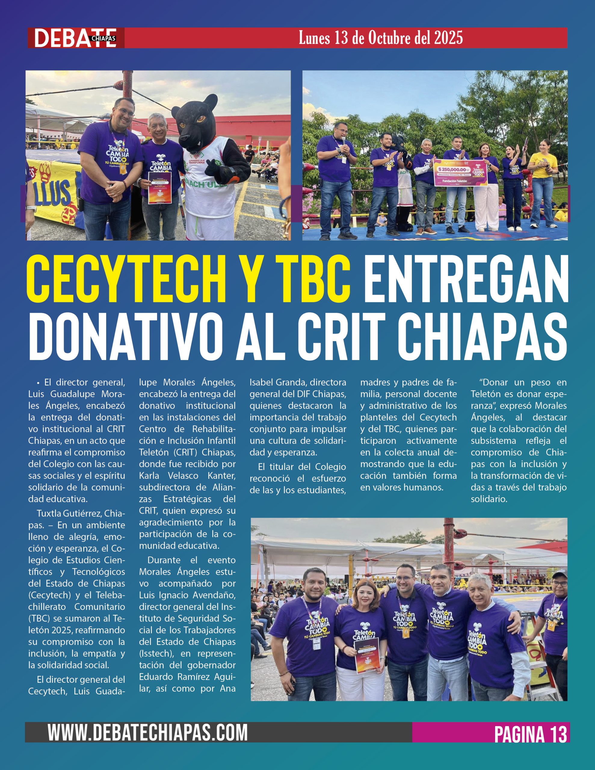 Tuxtla Gutiérrez, Chiapas. – En un ambiente lleno de alegría, emoción y esperanza, el Colegio de Estudios Científicos y Tecnológicos del Estado de Chiapas (Cecytech) y el Telebachillerato Comunitario (TBC) se sumaron al Teletón 2025, reafirmando su compromiso con la inclusión, la empatía y la solidaridad social.